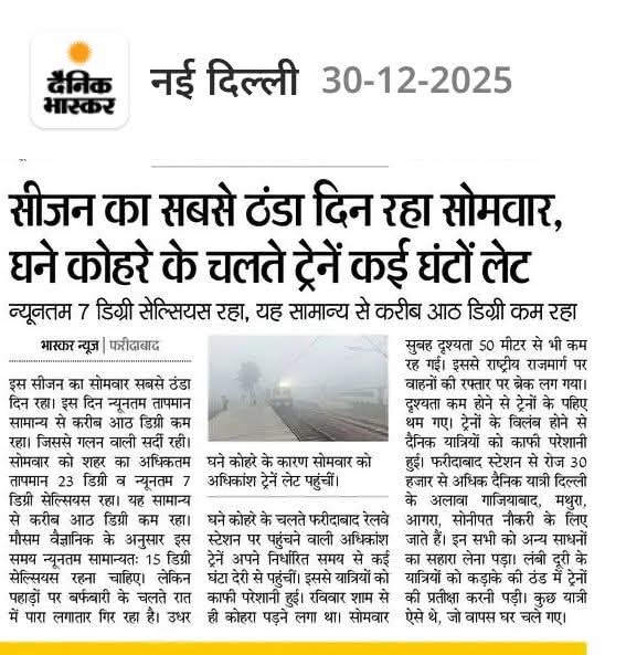 सीजन का सबसे ठंडा दिन रहा सोमवार, घने कोहरे के चलते ट्रेनें कई घंटों लेट