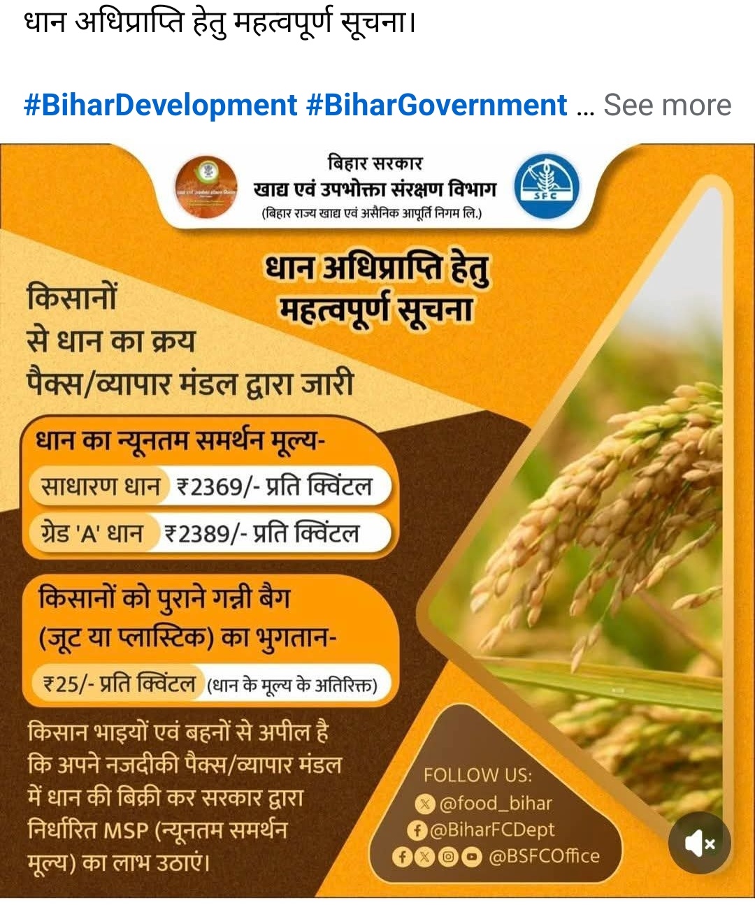 बिहार में धान अधिप्राप्ति हेतु महत्वपूर्ण सूचना।।