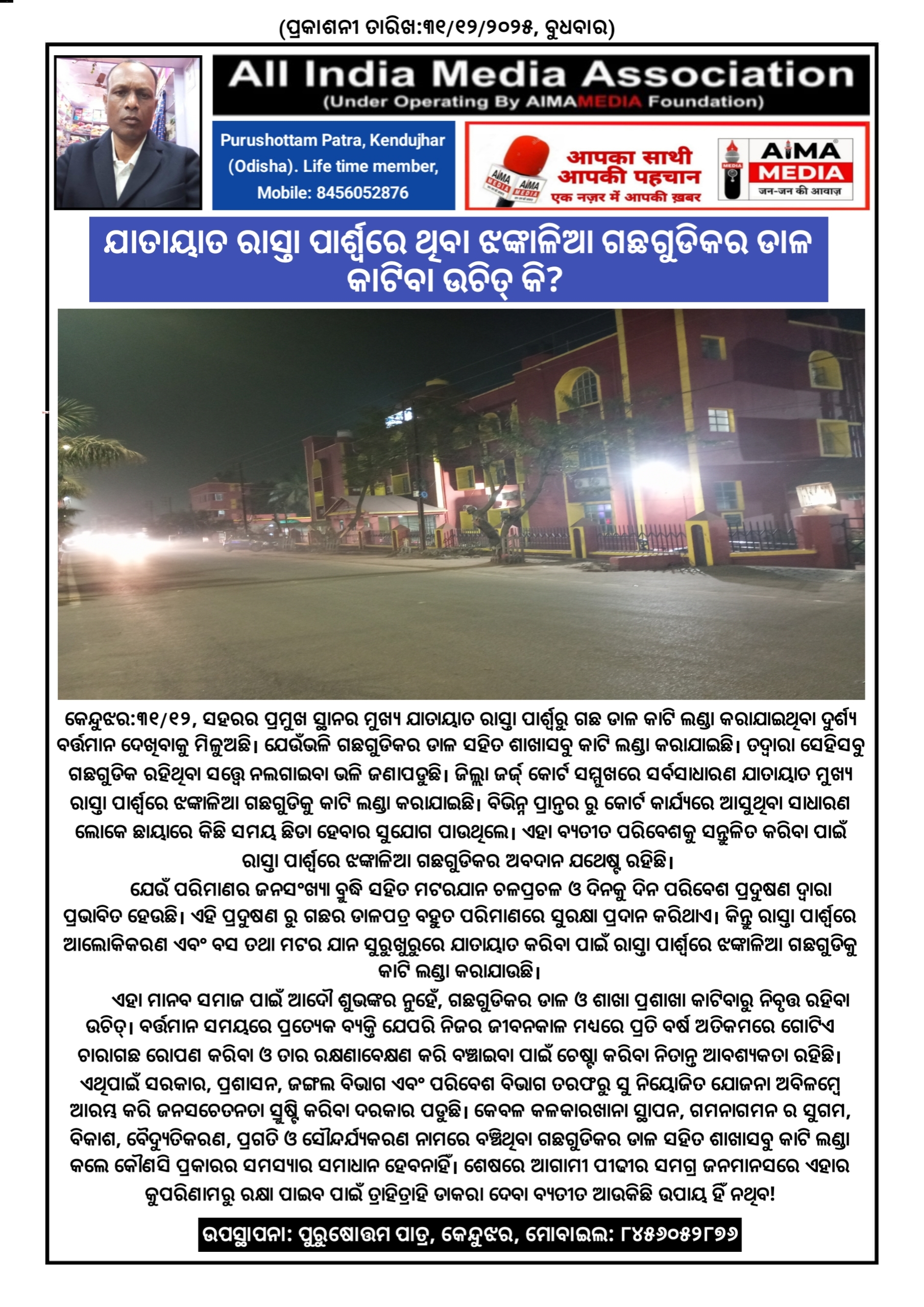 କେନ୍ଦୁଝର:୩୧/୧୨, ସହରର ପ୍ରମୁଖ ସ୍ଥାନର ମୁଖ୍ଯ ଯାତାୟାତ ରାସ୍ତା ପାର୍ଶ୍ବରୁ ଗଛ ଡାଳ କାଟି ଲଣ୍ଡା କରାଯାଇଥିବା ଦୁର୍ଶ୍ୟ ବର୍ତ୍ତମାନ ଦେଖିବାକୁ ମିଳୁଅଛି। ଯେଉଁଭଳି ଗଛଗୁଡିକର ଡାଳ ସହିତ ଶାଖାସବୁ କାଟି ଲଣ୍ଡା କରାଯାଇଛି। ତଦ୍ବାରା ସେହିସବୁ ଗଛଗୁଡିକ ରହିଥିବା ସତ୍ତ୍ବେ ନଲଗାଇବା ଭଳି ଜଣାପଡୁଛି। ଜିଲ୍ଲା ଜର୍ଜ୍ କୋର୍ଟ ସମ୍ମୁଖରେ ସର୍ବସାଧାରଣ ଯାତାୟାତ ମୁଖ୍ଯ ରାସ୍ତା ପାର୍ଶ୍ବରେ ଝଙ୍କାଳିଆ ଗଛଗୁଡିକୁ କାଟି ଲଣ୍ଡା କରାଯାଇଛି। ବିଭିନ୍ନ ପ୍ରାନ୍ତର ରୁ କୋର୍ଟ କାର୍ଯ୍ୟରେ ଆସୁଥିବା ସାଧାରଣ ଲୋକେ ଛାୟାରେ କିଛି ସମୟ ଛିଡା ହେବାର ସୁଯୋଗ ପାଉଥିଲେ। ଏହା ବ୍ୟତୀତ ପରିବେଶକୁ ସନ୍ତୁଳିତ କରିବା ପାଇଁ ରାସ୍ତା ପାର୍ଶ୍ବରେ ଝଙ୍କାଳିଆ ଗଛଗୁଡିକର ଅବଦାନ ଯଥେଷ୍ଟ ରହିଛି।