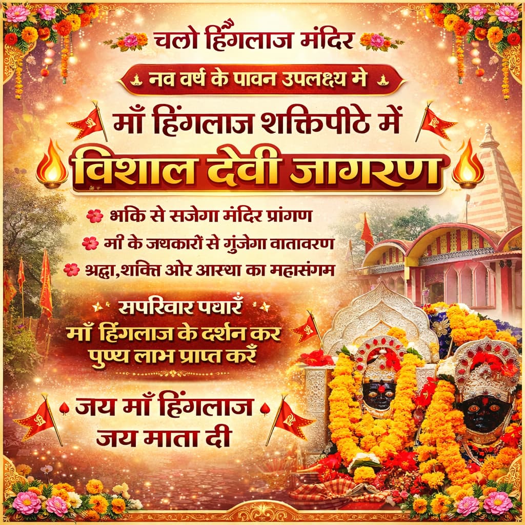 आयोजन समिति ने सभी भक्तों से समय पर पहुंचकर मां हिंगलाज की आराधना में सहभागी बनने और नव वर्ष को भक्ति एवं उत्सव के साथ मनाने की अपील की है।