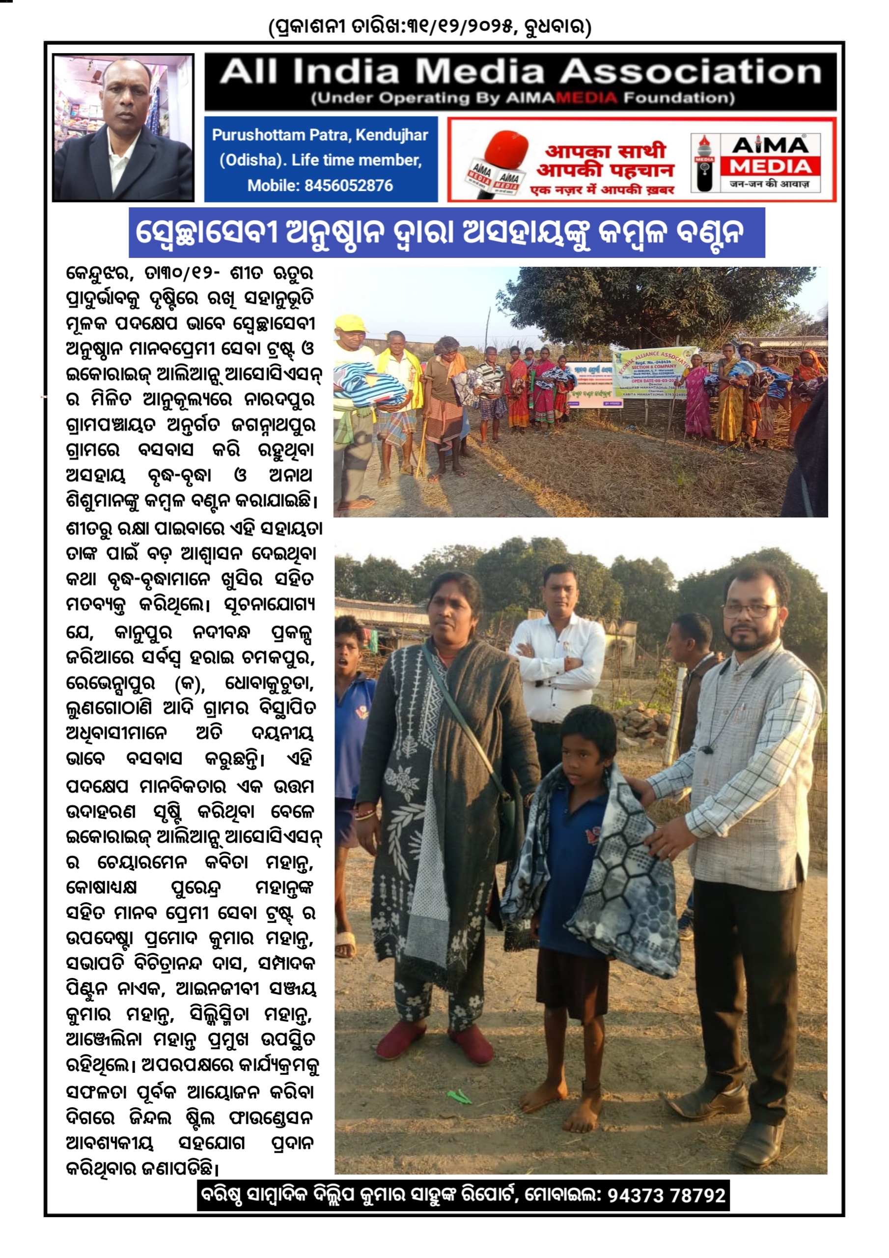 କେନ୍ଦୁଝର,ତା୩୦/୧୨- ଶୀତ ଋତୁର ପ୍ରାଦୁର୍ଭାବକୁ ଦୃଷ୍ଟିରେ ରଖି ସହାନୁଭୂତି ମୂଳକ ପଦକ୍ଷେପ ଭାବେ ସ୍ବେଚ୍ଛାସେବୀ ଅନୁଷ୍ଠାନ ମାନବପ୍ରେମୀ ସେବା ଟ୍ରଷ୍ଟ୍ ଓ ଇକୋରାଇଜ୍ ଆଲିଆନ୍ସ୍ ଆସୋସିଏସନ୍ ର ମିଳିତ ଆନୁକୂଲ୍ୟରେ ନାରଦପୁର ଗ୍ରାମପଞ୍ଚାୟତ ଅନ୍ତର୍ଗତ ଜଗନ୍ନାଥପୁର ଗ୍ରାମରେ ବସବାସ କରି ରହୁଥିବା ଅସହାୟ ବୃଦ୍ଧ-ବୃଦ୍ଧା ଓ ଅନାଥ ଶିଶୁମାନଙ୍କୁ କମ୍ବଳ ବଣ୍ଟନ କରାଯାଇଛି । ଶୀତରୁ ରକ୍ଷା ପାଇବାରେ ଏହି ସହାୟତା ତାଙ୍କ ପାଇଁ ବଡ଼ ଆଶ୍ୱାସନ ଦେଇଥିବା କଥା ବୃଦ୍ଧ-ବୃଦ୍ଧାମାନେ ଖୁସିର ସହିତ ମତବ୍ୟକ୍ତ କରିଥିଲେ । ସୂଚନାଯୋଗ୍ୟ ଯେ, କାନୁପୁର ନଦୀବନ୍ଧ ପ୍ରକଳ୍ପ ଜରିଆରେ ସର୍ବସ୍ବ ହରାଇ ଚମକପୁର, ରେଭେନ୍ସାପୁର (କ), ଧୋବାକୁଚୁଡା, ଲୁଣଗୋଠାଣି ଆଦି ଗ୍ରାମର ବିସ୍ଥାପିତ ଅଧିବାସୀମାନେ ଅତି ଦୟନୀୟ ଭାବେ ବସବାସ କରୁଛନ୍ତି । ଏହି ପଦକ୍ଷେପ ମାନବିକତାର ଏକ ଉତ୍ତମ ଉଦାହରଣ ସୃଷ୍ଟି କରିଥିବା ବେଳେ ଇକୋରାଇଜ୍ ଆଲିଆନ୍ସ୍ ଆସୋସିଏସନ୍ ର ଚେୟାରମେନ କବିତା ମହାନ୍ତ, କୋଷାଧ୍ୟକ୍ଷ ପୁରେନ୍ଦ୍ର ମହାନ୍ତଙ୍କ ସହିତ ମାନବ ପ୍ରେମୀ ସେବା ଟ୍ରଷ୍ଟ୍ ର ଉପଦେଷ୍ଟା ପ୍ରମୋଦ କୁମାର ମହାନ୍ତ, ସଭାପତି ବିଚିତ୍ରାନନ୍ଦ ଦାସ, ସମ୍ପାଦକ ପିଣ୍ଟୁନ ନାଏକ, ଆଇନଜୀବୀ ସଞ୍ଜୟ କୁମାର ମହାନ୍ତ, ସିଲ୍କିସ୍ମିତା ମହାନ୍ତ, ଆଞ୍ଜେଲିନା ମହାନ୍ତ ପ୍ରମୁଖ ଉପସ୍ଥିତ ରହିଥିଲେ । ଅପରପକ୍ଷରେ କାର୍ଯ୍ୟକ୍ରମକୁ ସଫଳତା ପୂର୍ବକ ଆୟୋଜନ କରିବା ଦିଗରେ ଜିନ୍ଦଲ ଷ୍ଟିଲ ଫାଉଣ୍ଡେସନ ଆବଶ୍ୟକୀୟ ସହଯୋଗ ପ୍ରଦାନ କରିଥିବାର ଜଣାପଡିଛି ।