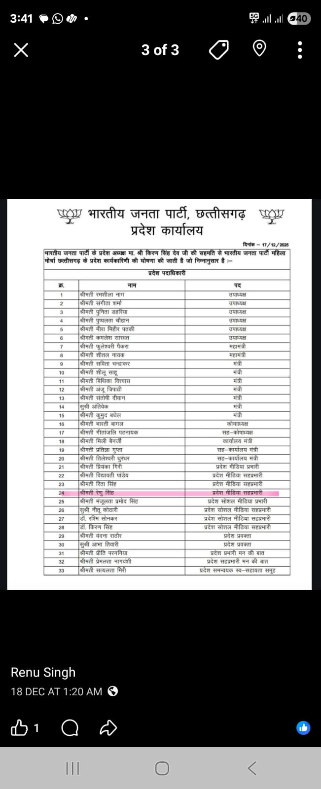 एंकर:- भारतीय जनता पार्टी के प्रदेश अध्यक्ष श्रीमती किरण सिंह देव की सहमति से भारतीय जनता पार्टी महिला प्रदेश कार्यकारिणी की घोषणा की गई जिसमें कोरिया जिला की बेटी श्रीमती रेनू सिंह को प्रदेश मीडिया सह प्रभारी की दायित्व दी गई जब उनसे उनके दायित्व के बारे में जाना तो वही रेनू सिंह का कहना था कि भारतीय जनता पार्टी महिला मोर्चा के प्रदेश कार्यकारिणी में जो मुझे दायित्व मिली है उसे में पूरे निष्ठा और भाव के साथ निभाने की कोशिश करूंगी वहीं उन्होंने कहा कि प्रदेश अध्यक्ष श्रीमती किरण सिंह देव व पार्टी के सभी पदाधिकारी कोरिया जिला अध्यक्ष देवेंद्र तिवारी का काफी सहयोग व मार्गदर्शन रहा
