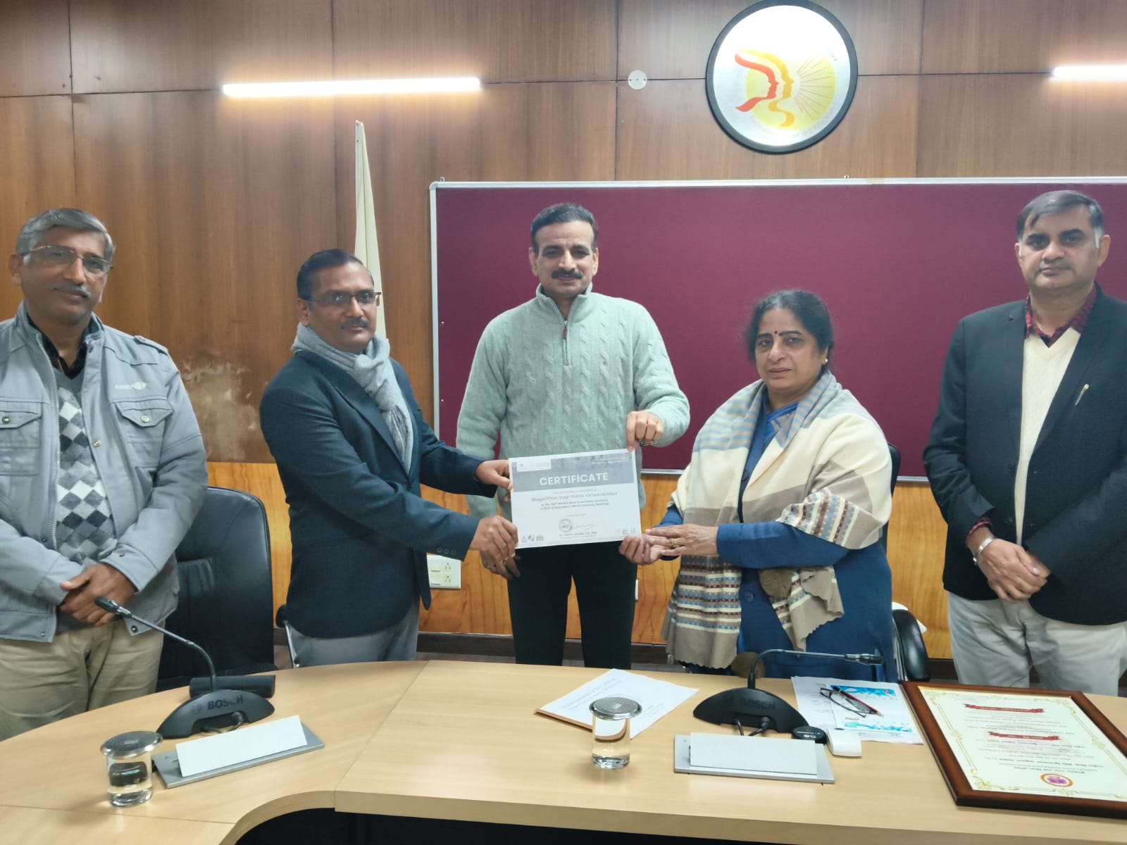 फोटो कैप्शन :-01 आंतरिक गुणवत्ता प्रकोष्ठ के निदेशक प्रो. अशोक वर्मा को प्रमाण पत्र भेंट करते कुलपति प्रो सुदेश व कुलसचिव प्रो शिवालिक यादव।