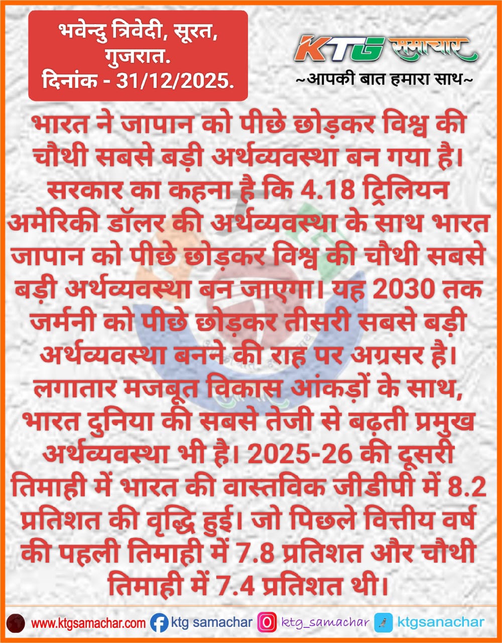 भारत ने जापान को पीछे छोड़कर विश्व की चौथी सबसे बड़ी अर्थव्यवस्था बन गया है।