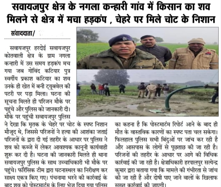 सवायजपुर क्षेत्र के नगला कन्हारी गांव में किसान का शव मिलने से क्षेत्र में मंचा हड़कंप चेहरे पर मिले चोट के निशान