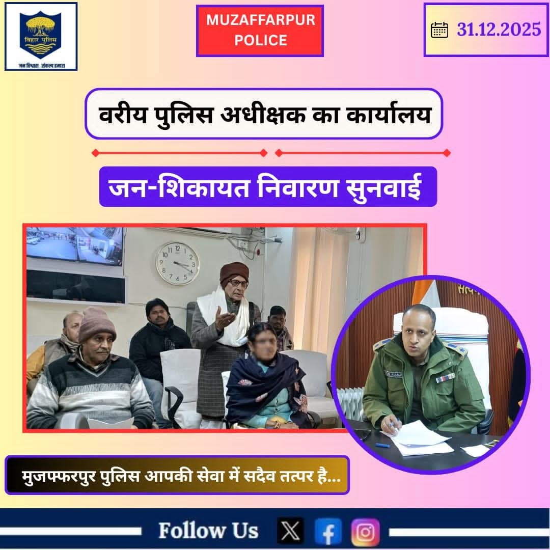 आज दिनांक 31.12.2025 को वरीय पुलिस अधीक्षक, मुजफ्फरपुर द्वारा जनता दरबार में जन सुनवाई