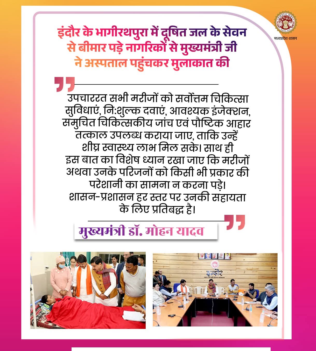 इंदौर के भागीरथपुरा में दूषित जल के सेवन से बीमार पड़े नागरिकों से मुख्यमंत्री ने अस्पताल पहुंचकर मुलाकात की