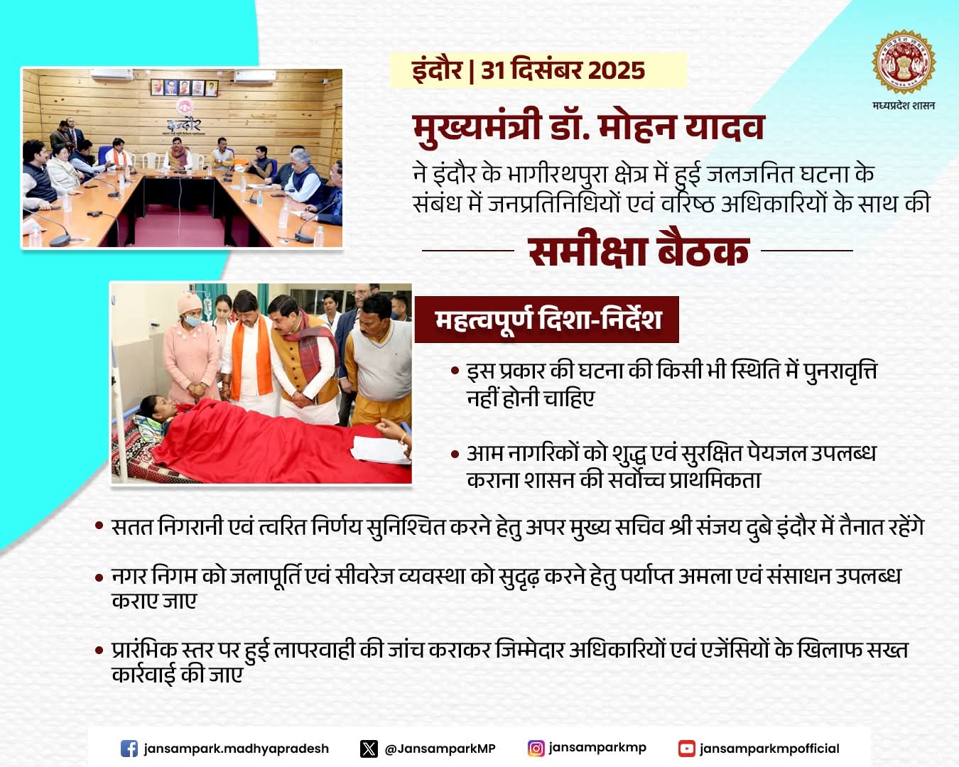 मुख्यमंत्री डॉ. मोहन यादव ने इंदौर के भागीरथपुरा क्षेत्र में हुई जलजनित घटना के संबंध में जनप्रतिनिधियों एवं वरिष्ठ अधिकारियों के साथ की समीक्षा बैठक