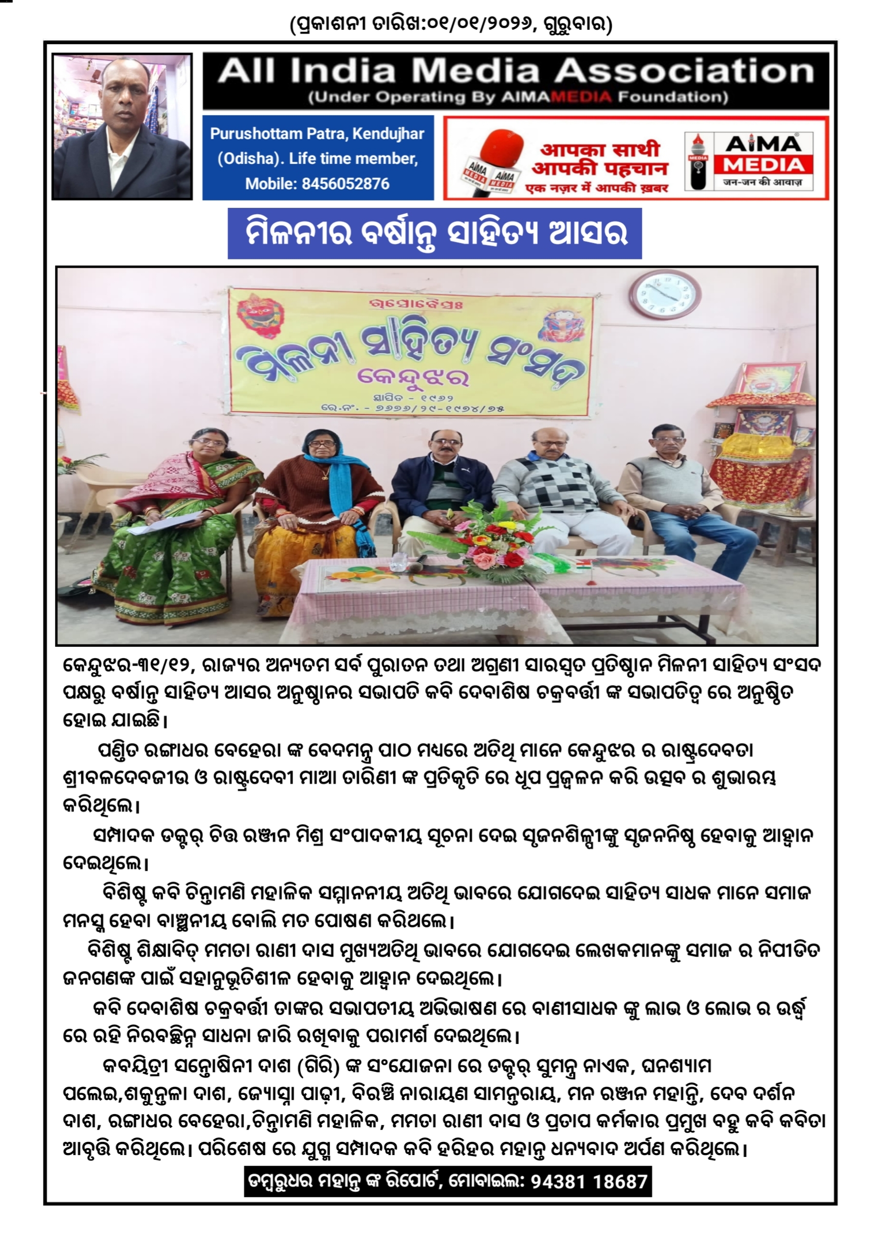 କେନ୍ଦୁଝର -୩୧/୧୨, ରାଜ୍ୟର ଅନ୍ୟତମ ସର୍ବ ପୁରାତନ ତଥା ଅଗ୍ରଣୀ ସାରସ୍ୱତ ପ୍ରତିଷ୍ଠାନ ମିଳନୀ ସାହିତ୍ୟ ସଂସଦ ପକ୍ଷରୁ ବର୍ଷାନ୍ତ ସାହିତ୍ୟ ଆସର ଅନୁଷ୍ଠାନର ସଭାପତି କବି ଦେବାଶିଷ ଚକ୍ରବର୍ତ୍ତୀ ଙ୍କ ସଭାପତିତ୍ବ ରେ ଅନୁଷ୍ଠିତ ହୋଇ ଯାଇଛି।