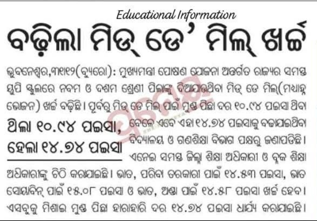 ପଇସା ଥିବା ବେଳେ ବର୍ତମାନ ତାହା ବୣ୍ଧି ଘଟି 14.74 ପଇସା କୁ ବୣର୍ଧ ଘଟିଛି, ଏହା ବିଦ୍ୟାଳୟ ଓ ଗଣଶିକ୍ଷା ବିଭାଗରୁ ଜଣାପଡିଛି। ଭାତ, ପରିବା ତରକାରି ପାଇଁ 14.53ପଇସା, ଭାତ ସୟାବିନ୍ ପାଇଁ 15•08ପଇସା ଓଭାତ ଅଣ୍ଡା ପାଇଁ 14.58 ପଇସା ଖର୍ଚ୍ଚ ହେବ। ଏସବୁ ମିଶାଇ ମୁଣ୍ଡ ପିଛା ହାରାହାରି ଦର14.74 ପଇସା ଧାର୍ଯ୍ୟ କରାଯାଇଛି।