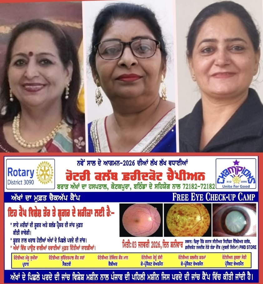 ਰੋਟਰੀ ਕਲੱਬ ਫਰੀਦਕੋਟ ਚੈਂਪੀਅਨ ਵੱਲੋਂ ਅੱਖਾਂ ਦਾ ਚੈੱਕਅਪ,ਸ਼ੁਗਰ ਅਤੇ ਬਲੱਡ ਪ੍ਰੈਸ਼ਰ ਚੈਕ ਅਪ ਦਾ ਕੈਂਪ ਫਰੀਕੋਟ ਵਿਖੇ 03 ਜਨਵਰੀ ਨੂੰ -- ਮੰਜੂ ਸੁਖੀਜਾ ਸੁਰਿੰਦਰ ਪਾਲ ਸਰਾਂ
