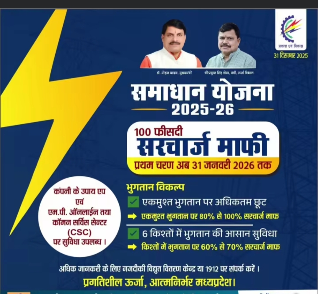 मध्य प्रदेश सरकार की समाधान योजना 2025-26 के प्रथम चरण की अवधि एक माह और बढ़ा दी गई है। यह जानकारी ऊर्जा मंत्री श्री प्रद्युम्न सिंह तोमर ने आज भोपाल में दी। उन्होंने बताया कि बकायादार उपभोक्ताओं की सतत भागीदारी और उनके उत्साह को देखते हुए योजना के प्रथम चरण की अवधि अब 31 जनवरी 2026 कर दी गई है। पिछले साल 3 नवंबर से शुरू हुई समाधान योजना 2025-26 में शामिल होकर लाखों बकायादार उपभोक्ताओं ने सौ फीसदी तक छूटका लाभ लिया। कंपनी ने उपभोक्ताओं से अपील की है कि तीन माह से अधिक के बकायादार उपभोक्ता योजना के प्रथम चरण में शामिल होकर अपना बकाया बिल एकमुश्त जमा करके 100 फीसदी तक सरचार्ज माफी का लाभ उठा सकते हैं। मध्य प्रदेश सरकार की समाधान योजना 2025-26 के प्रथम चरण में अब तक मध्य क्षेत्र विद्युत वितरण कंपनी के 3 लाख 30 हजार 031 बकायादार उपभोक्ताओं ने अपना पंजीयन कराकर लाभलिया है। मध्य क्षेत्र विद्युत वितरण कंपनी के खाते में 376 करोड़ 10 लाखा से अधिक की मूल राशि जमा हुई है, जबकि 206 करोड़ 89 लाखख रूपए का सरचार्ज माफ किया गया है।