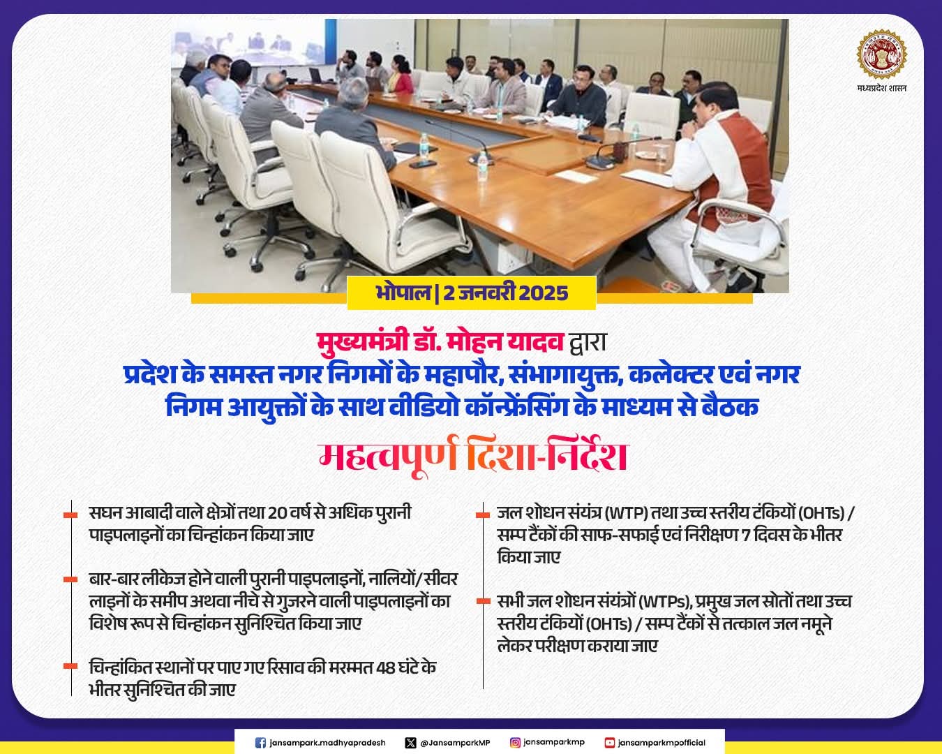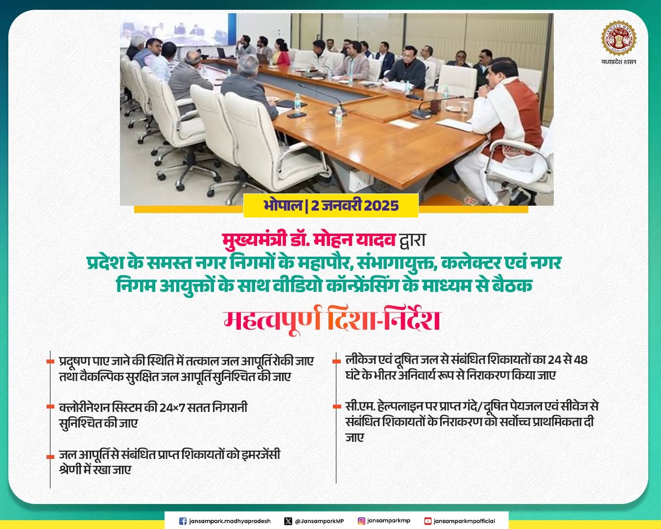 मुख्यमंत्री डॉ. मोहन यादव द्वारा प्रदेश के समस्त नगर निगमों के महापौर, संभागायुक्त, कलेक्टर एवं नगर निगम आयुक्तों के साथ वीडियो कॉन्फ्रेंसिंग के माध्यम से बैठक