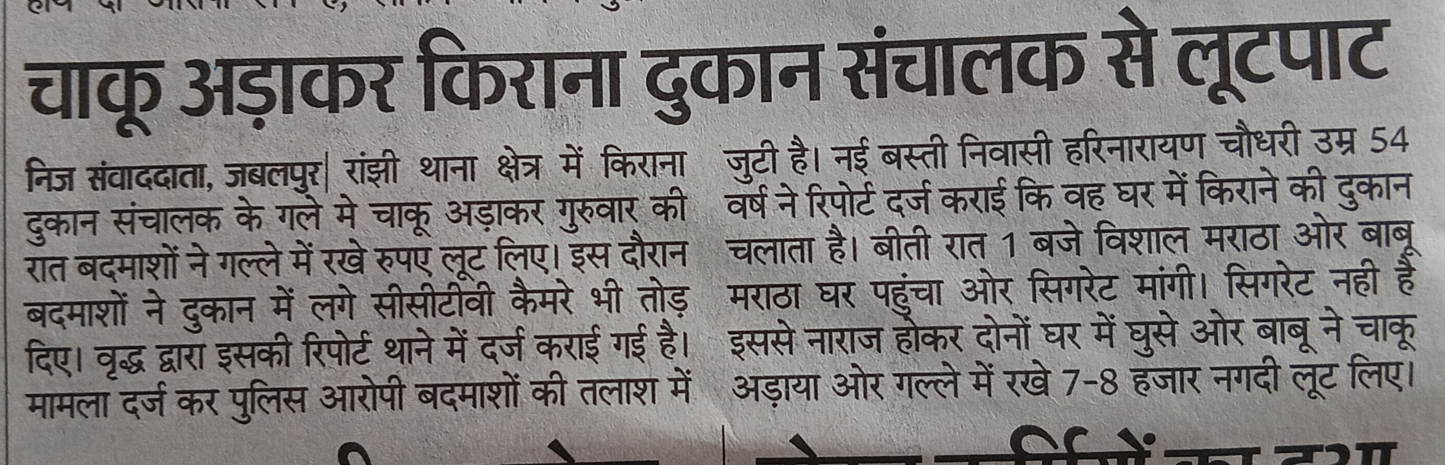 रांझी क्षेत्र में किराना दुकान संचालक की गले में चाकू अडा़कार गुरुवार की रात बदमाशों ने दुकान में रखे पैसे में लूट लिए