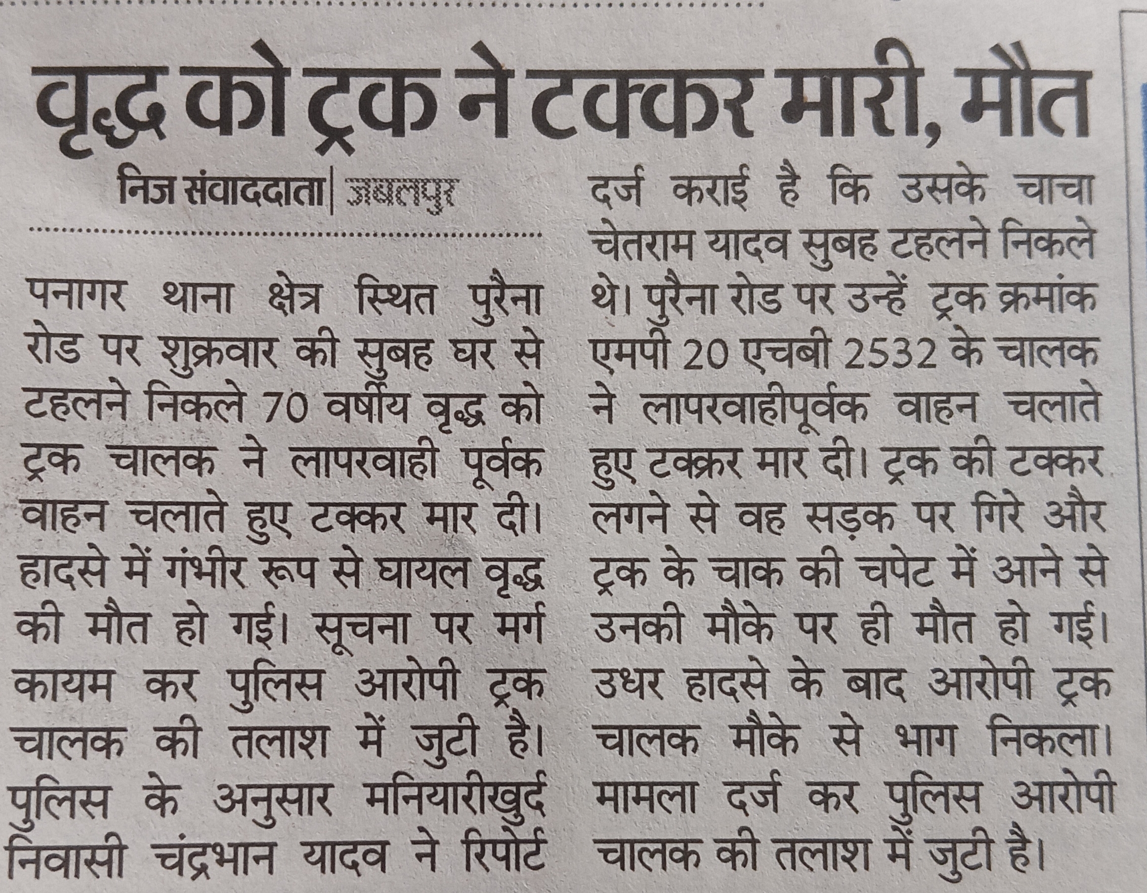 पनागर क्षेत्र स्थित पुरैना रोड पर शुक्रवार की सुबह घर से टहलने निकली थी 70 वर्षीय बुजुर्ग को ट्रक चालक ने लापरवाही पूर्वक वाहन चलाते हुए टक्कर मार दी