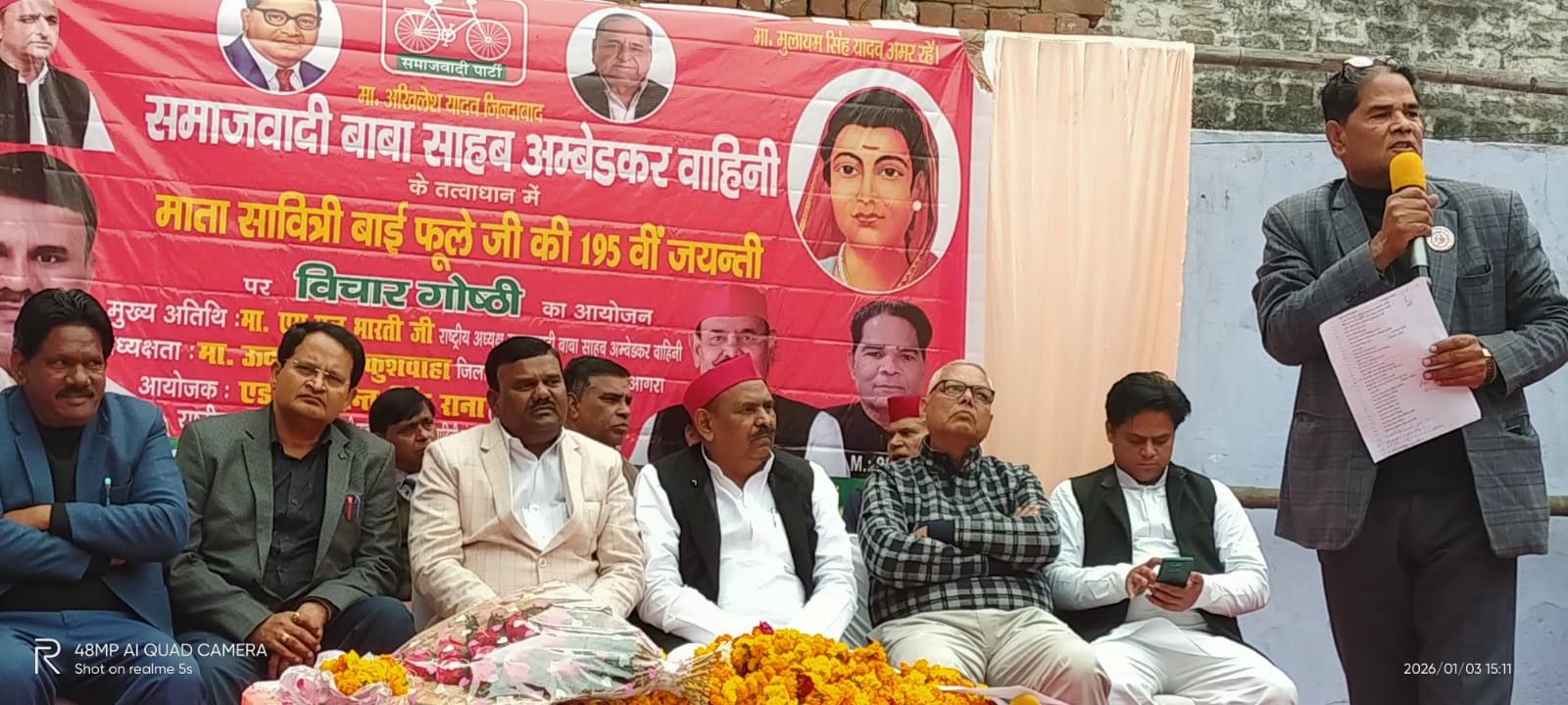 आगरा- दिनांक 3 जनवरी 2026 को भारत की प्रथम शिक्षिका माता सावित्रीबाई फुले की 195वीं जन्म जयंती के उपलक्ष्य में बाबा साहब डॉक्टर अंबेडकर वाहिनी, समाजवादी पार्टी के तत्वावधान में एक विचार गोष्ठी का आयोजन किया गया। यह कार्यक्रम सुखराम कुशवाहा की धर्मशाला, कटरा वज़ीर खान, आगरा में संपन्न हुआ।