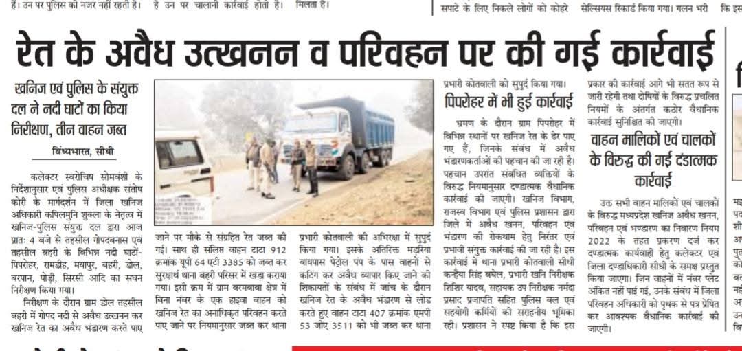 कलेक्टर स्वरोचिष सोमवंशी के निर्देशानुसार एवं पुलिस अधीक्षक संतोष कोरी के मार्गदर्शन में जिला खनिज अधिकारी कपिलमुनि शुक्ला के नेतृत्व में खनिज-पुलिस संयुक्त दल द्वारा आज प्रातः 4 बजे से तहसील गोपदबनास एवं तहसील बहरी के विभिन्न नदी घाटों पिपरोहर, रामडीह, मयापुर, बहरी, डोल, बरपान, पोड़ी, सिरसी आदि का सघन निरीक्षण किया गया।