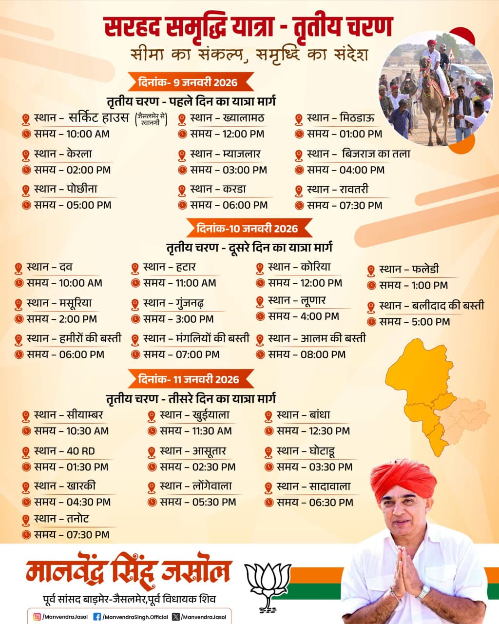जैसलमेर।(सी आर देवपाल म्याजलार)। पूर्व सांसद और भाजपा के वरिष्ठ नेता कर्नल मानवेन्द्र सिंह जसोल की सरहद समृद्धि यात्रा के तीसरे चरण का आगाज़ ख्याला मठ म्याजलार से नो जनवरी को होगा जैसलमेर में होटल रावलकोट से मानवेन्द्र सिंह अपने सैकड़ों समर्थकों के वाहनों के काफिले के साथ प्रात नो बजे म्याजलार के लिए प्रस्थान करेंगे ।कर्नल मानवेन्द्र सिंह जैसलमेर जिले में सरहद समृद्धि यात्रा के तीसरे चरण में कोई सौ से अधिक गांवों में जन संवाद स्थापित करेंगे यात्रा के दौरा रात्रि विश्राम भी गांवों में आयोजित होगा मानवेन्द्र सिंह ग्रामीणों के साथ उनकी समस्याओं और लेकर चर्चा करेंगे मानवेन्द्र सिंह नो जनवरी को ख्याला मठ म्याजलार मिठड़ाऊ केरला म्याजलार बिजराज का तला पोछीणा और करड़ा में संवाद स्थापित करेंगे रात्रि विश्राम रावतारी करेंगे दस जनवरी को यात्रा रावतरी दव हटार कोरिया फलेडी मंसुरिया गुंजनगढ़ लुनार बलिदाद की बस्ती हमीरों की बस्ती और मंगलियों की बस्ती में रहेंगे वही ग्यारह जनवरी को आलम की बस्ती सियाम्बर खुईयाला बांधा 40 आर डी आसुतार घोटारू खारकी लोंगेवाला और सादावाला मे जन संवाद स्थापित करेंगे बारह जनवरी को तनोट रणाऊ पी टी एम् सुथार मंडी बाहला भारेवाला आकलवाड़ा ठाकालवाड़ा जालूवाला खेरूवाला तवारियावाला खारा भारमसर में ग्रामीणों से रूबरू होंगे तेरह जनवरी को नोख बोराणा मदासर चिन्नू अवाय भादरिया नाचना सत्याया आसकरणा दिघु छायण अजासर और लोहारकी में जनसंवाद स्थापित कर रामदेवरा प्रस्थान करेंगे यात्रा के तीसरे चरण का समापन रामदेवरा में करेंगे।