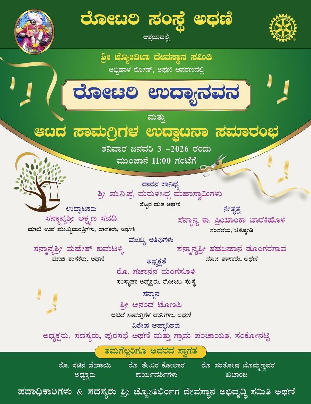 ರೋಟರಿ ಸಂಸ್ಥೆ ಅಥಣಿ ಮತ್ತು ಶ್ರೀ ಜ್ಯೋತಿಬಾ ದೇವಸ್ಥಾನ ಸಮಿತಿ ಆಶ್ರಯದಲ್ಲಿ ಅಥಣಿಯ ಅಬ್ಬಿಹಾಳ ರಸ್ತೆಯ ಶ್ರೀ ಜ್ಯೋತಿಬಾ ದೇವಸ್ಥಾನ ಆವರಣದಲ್ಲಿ ನಿರ್ಮಿಸಲಾದ ರೋಟರಿ ಉದ್ಯಾನವನವನ್ನು ಇತ್ತೀಚೆಗೆ ಚಿಕ್ಕೋಡಿ ಲೋಕಸಭಾ ಸದಸ್ಯೆ ಪ್ರಿಯಾಂಕ ಜಾರಕಿಹೊಳಿ ಅವರು ಉದ್ಘಾಟಿಸಿದ್ದಾರೆ, ಈ ಕಾರ್ಯಕ್ರಮವು ಸಾರ್ವಜನಿಕರ ಅನುಕೂಲಕ್ಕಾಗಿ ಮತ್ತು ವಿನೋದಕ್ಕಾಗಿ ಒಂದು ಹೊಸ ಸ್ಥಳದ ಉದ್ಘಾಟನೆಯಾಗಿದೆ.