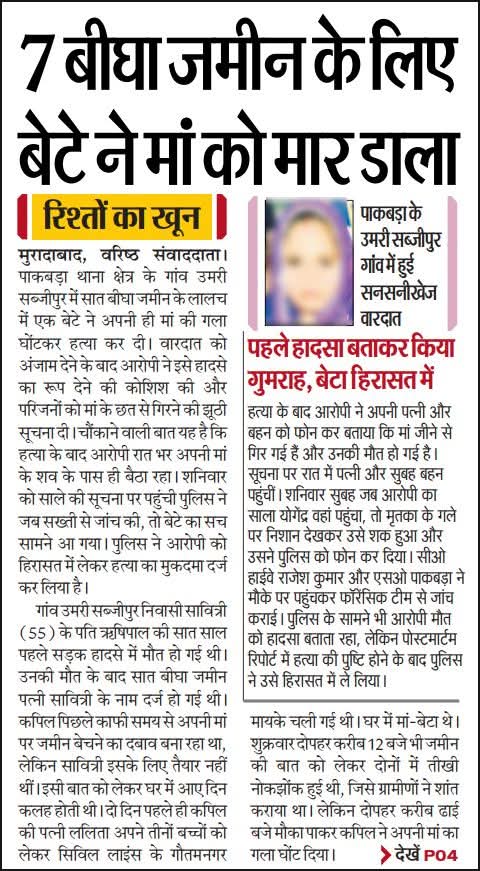 माता की हत्या करने के आरोपी को थाना पाकबड़ा पुलिस ने किया गिरफ्तार ।