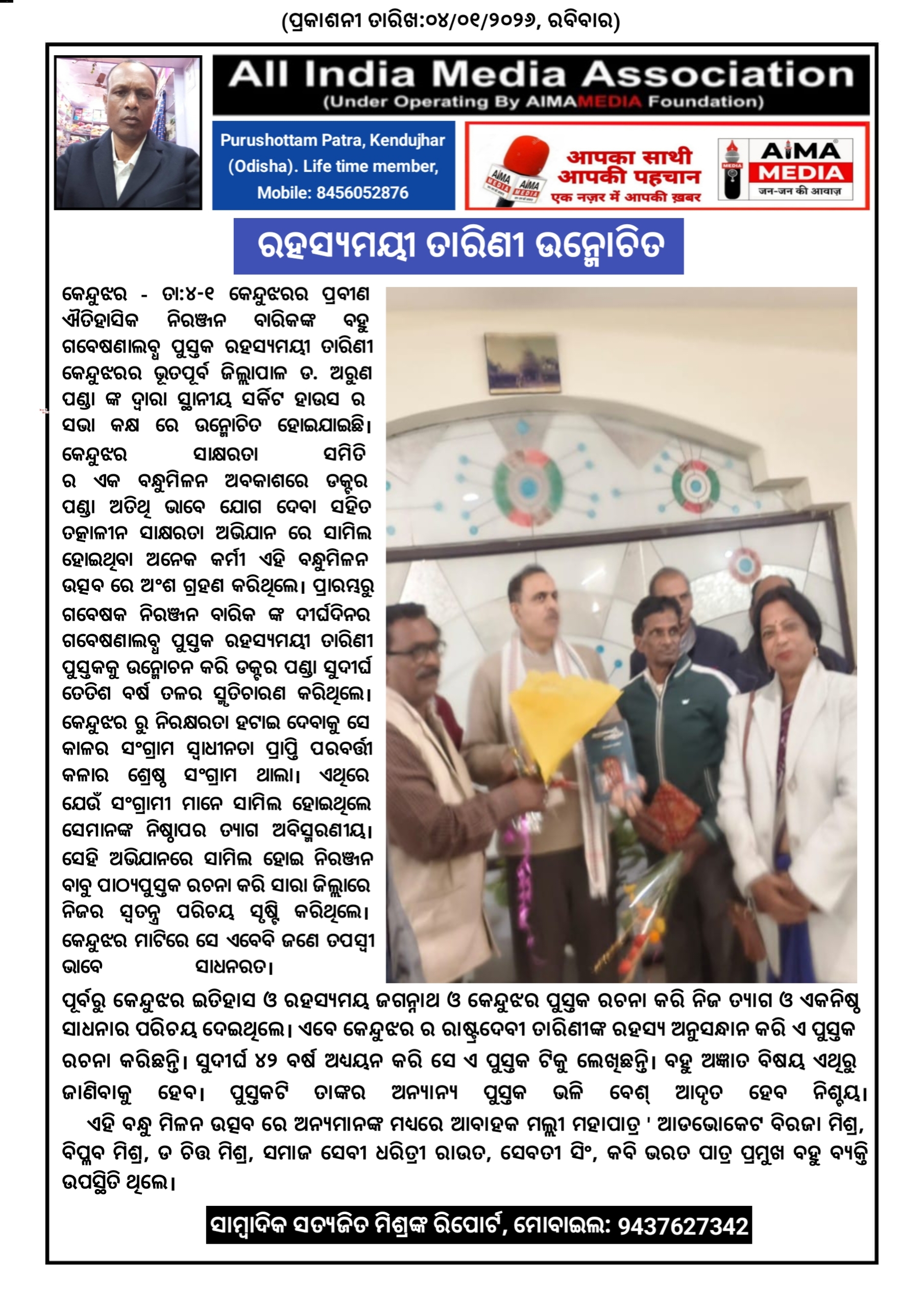 କେନ୍ଦୁଝର - ତା ୪-୧-୨୬ କେନ୍ଦୁଝର ର ପ୍ରବୀଣ ଐତିହାସିକ ନିରଞ୍ଜନ ବାରିକଙ୍କ ବହୁ ଗବେଷଣାଲବ୍ଧ ପୁସ୍ତକ ରହସ୍ୟମୟୀ ତାରିଣୀ କେନ୍ଦୁଝରର ଭୂତପୂର୍ବ ଜିଲ୍ଲାପାଳ ଡ ଅରୁଣ ପଣ୍ଡା ଙ୍କ ଦ୍ଵାରା ସ୍ଥାନୀୟ ସର୍କିଟ ହାଉସ ର ସଭା କକ୍ଷ ରେ ଉନ୍ମୋଚିତ ହୋଇଯାଇଛି । କେନ୍ଦୁଝର ସାକ୍ଷରତା ସମିତି ର ଏକ ବନ୍ଧୁମିଳନ ଅବକାଶରେ ଡକ୍ଟର ପଣ୍ଡା ଅତିଥି ଭାବେ ଯୋଗ ଦେବା ସହିତ ତତ୍କାଳୀନ ସାକ୍ଷରତା ଅଭିଯାନ ରେ ସାମିଲ ହୋଇଥିବା ଅନେକ କର୍ମୀ ଏହି ବନ୍ଧୁମିଳନ ଉତ୍ସବ ରେ ଅଂଶ ଗ୍ରହଣ କରିଥିଲେ ।ପ୍ରାରମ୍ଭରୁ ଗବେଷକ ନିରଞ୍ଜନ ବାରିକ ଙ୍କ ଦୀର୍ଘଦିନର ଗବେଷଣାଲବ୍ଧ ପୁସ୍ତକ ରହସ୍ୟମୟୀ ତାରିଣୀ ପୁସ୍ତକକୁ ଉନ୍ମୋଚନ କରି ଡକ୍ଟର ପଣ୍ଡା ସୁଦୀର୍ଘ ତେତିଶ ବର୍ଷ ତଳର ସ୍ମୃତିଚାରଣ କରିଥିଲେ । କେନ୍ଦୁଝର ରୁ ନିରକ୍ଷରତା ହଟାଇ ଦେବାକୁ ସେ କାଳର ସଂଗ୍ରାମ ସ୍ଵାଧୀନତା ପ୍ରାପ୍ତି ପରବର୍ତ୍ତୀ କଳାର ଶ୍ରେଷ୍ଠ ସଂଗ୍ରାମ ଥାଲା । ଏଥିରେ ଯେଉଁ ସଂଗ୍ରାମୀ ମାନେ ସାମିଲ ହୋଇଥିଲେ ସେମାନଙ୍କ ନିଷ୍ଠାପର ତ୍ୟାଗ ଅବିସ୍ମରଣୀୟ । ସେହି ଅଭିଯାନରେ ସାମିଲ ହୋଇ ନିରଞ୍ଜନ ବାବୁ ପାଠ୍ୟପୁସ୍ତକ ରଚନା କରି ସାରା ଜିଲ୍ଲାରେ ନିଜର ସ୍ଵତନ୍ତ୍ର ପରିଚୟ ସୃଷ୍ଟି କରିଥିଲେ । କେନ୍ଦୁଝର ମାଟିରେ ସେ ଏବେବି ଜଣେ ତପସ୍ୱୀ ଭାବେ ସାଧନରତ ।ପୂର୍ବରୁ କେନ୍ଦୁଝର ଇତିହାସ ଓ ରହସ୍ୟମୟ ଜଗନ୍ନାଥ ଓ କେନ୍ଦୁଝର ପୁସ୍ତକ ରଚନା କରି ନିଜ ତ୍ୟାଗ ଓ ଏକନିଷ୍ଠ ସାଧନାର ପରିଚୟ ଦେଇଥିଲେ । ଏବେ କେନ୍ଦୁଝର ର ରାଷ୍ଟ୍ରଦେବୀ ତାରିଣୀଙ୍କ ରହସ୍ୟ ଅନୁସନ୍ଧାନ କରି ଏ ପୁସ୍ତକ ରଚନା କରିଛନ୍ତି । ସୁଦୀର୍ଘ ୪୨ ବର୍ଷ ଅଧ୍ୟୟନ କରି ସେ ଏ ପୁସ୍ତକ ଟିକୁ ଲେଖିଛନ୍ତି । ବହୁ ଅଜ୍ଞାତ ବିଷୟ ଏଥିରୁ ଜାଣିବାକୁ ହେବ । ପୁସ୍ତକଟି ତାଙ୍କର ଅନ୍ୟାନ୍ୟ ପୁସ୍ତକ ଭଳି ବେଶ୍ ଆଦୃତ ହେବ ନିଶ୍ଚୟ ।
