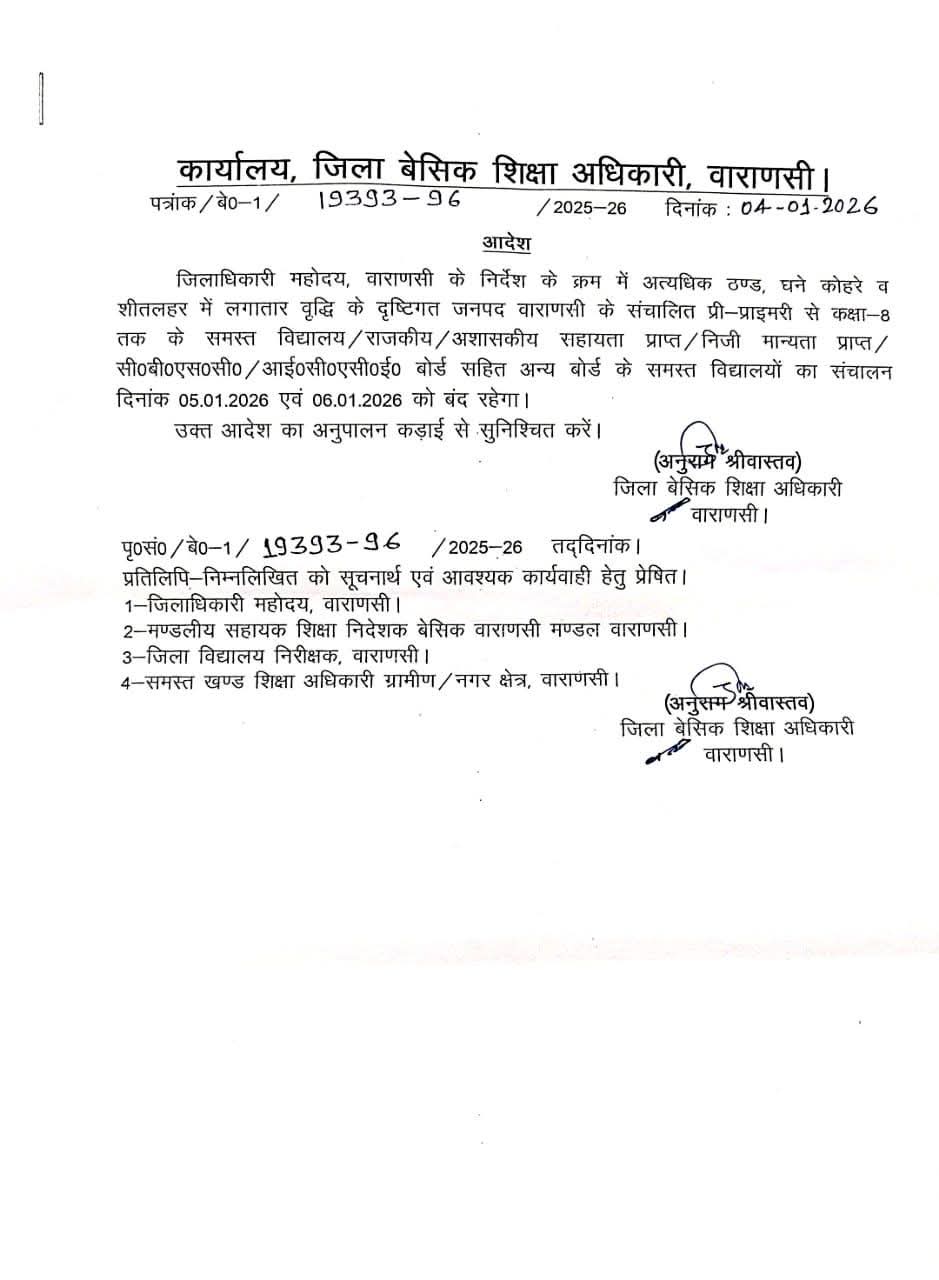 जारी आदेश में स्पष्ट किया गया है कि यह निर्णय जिलाधिकारी वाराणसी के निर्देश के क्रम में लिया गया है। लगातार बढ़ रही ठंड, घना कोहरा और शीतलहर के कारण बच्चों के स्वास्थ्य पर पड़ने वाले प्रतिकूल प्रभाव को ध्यान में रखते हुए यह एहतियाती कदम उठाया गया है।
