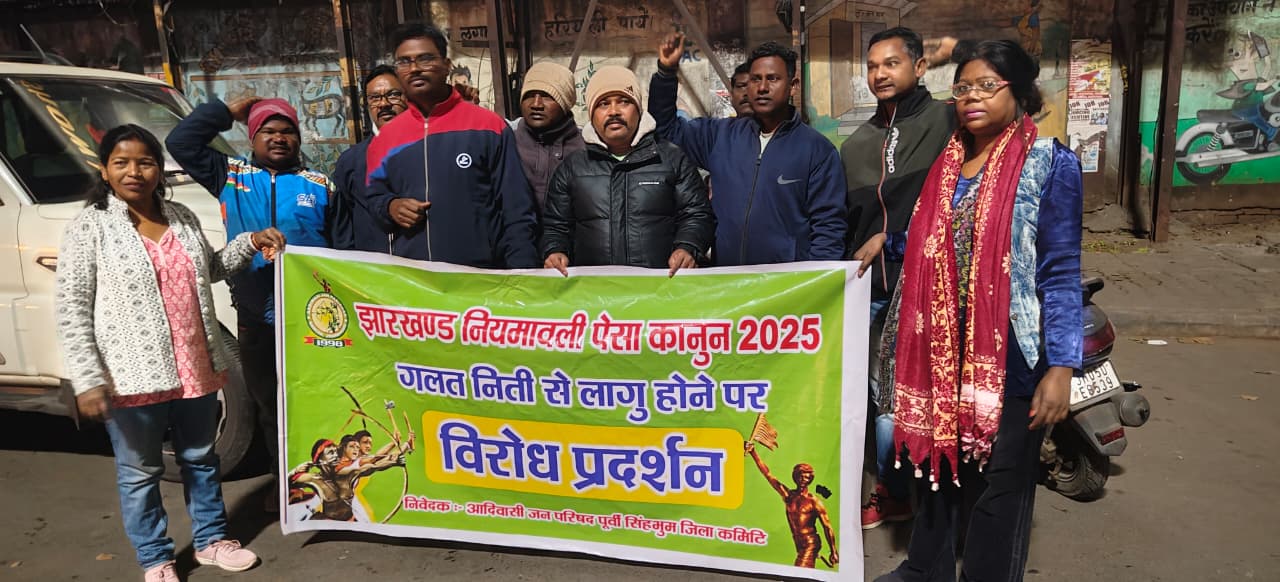 जमेशेदपुर :- आज दिनांक 5.1.2026 को साकची गोल चक्कर में आदिवासी जन परिषद के जिला सचिव जगदीश भूमिज के नेतृत्व में झारखंड पेसा कानून 2025 का नियमावली के प्रारूप को जलाकर विरोध प्रदर्शन किया। इस मौके पर आदिवासी जन परिषद के केंद्रीय सचिव विष्णु सिंह मुंडा ने कहा कि यह पेसा कानून झारखंडियों के लिए काला कानून है । हेमंत सोरेन सरकार एक तरफ झारखंड की विकास की बात करता है और दूसरी तरफ उन्हें छलने का काम करता है जो शक्तियां ग्राम सभा को होनी चाहिए था वह खुद हेमंत सरकार ने अपने पास रख लिया कहने का मतलब यह है की मलाई सरकार खागा और चौकला ग्राम सभा को देगी । जब ग्राम सभा का कोष नहीं भर पाएगा तो ग्राम का विकास कहां से होगा । यह कानून झारखंडियों के लिए एक काला कानून है, जो बाहरी पूंजीपतियों को लाभ देगी इस मौके पर जिला सचिव जगदीश भूमिज ने कहा कि आदिवासी जनपरिषद हर मौके पर आदिवासियों और झारखंडियों के साथ खड़ी है और रहेगी यह काला कानून हम झारखंडी कतई बर्दाश्त नहीं करेंगे झारखंड में 1996 के अनुरूप पेसा कानून लागू किया जाए ।उपस्थित लोग रवि भूमिज केंद्रीय सदस्य ,जगदीश भूमिज जिला सचिव , रुबी बासा महिला मोर्चा जिला अध्यक्ष, राजू बेसरा जिला प्रधान सचिव ,शन्नी भूमिज, संजय राय ,राज सरदार शंकर भूमिज, सोना नाग, शिबू भूमिज आदि उपस्थित थे।