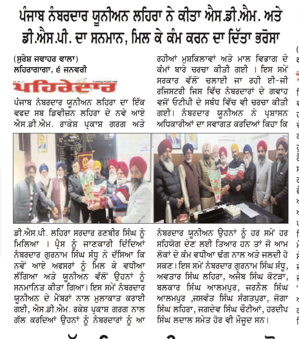 06 जनवरी: लहरागागा (सुरेश जवाहर वाला 90233-63132) पंजाब नंबरदार यूनियन लहरा का एक डेलीगेशन सब डिवीजन लहरा के नए आए SDM राकेश प्रकाश गर्ग और DSP लहरा सरदार रणबीर सिंह से मिला। प्रेस को जानकारी देते हुए नंबरदार गुरनाम सिंह संधू ने बताया कि नए आए अधिकारियों से मिलकर अच्छा लगा और यूनियन की तरफ से उन्हें सम्मानित किया गया। इस समय नंबरदार यूनियन के सदस्यों के साथ मीटिंग हुई, जिसमें SDM राकेश प्रकाश गर्ग से बात करते हुए नंबरदारों को आ रही दिक्कतों और रेवेन्यू डिपार्टमेंट के काम पर चर्चा की। इस समय सरकार की तरफ से चलाई जा रही E-G रजिस्ट्री पर भी चर्चा हुई जिसमें नंबरदारों के गवाह के तौर पर OTP पर भी चर्चा हुई। नंबरदार यूनियन ने एडमिनिस्ट्रेशन के अधिकारियों का स्वागत किया और कहा कि नंबरदार यूनियन उन्हें हर समय हर तरह का सपोर्ट देने के लिए तैयार है ताकि आम लोगों का काम अच्छे से और जल्दी हो सके। इस समय नंबरदार गुरनाम सिंह संधू, अवतार सिंह लहरा, अजैब सिंह कोटड़ा, बलकार सिंह आलमपुर, जरनैल सिंह आलमपुर, जसवंत सिंह संगतपुरा, जोगा सिंह लहरा, जगदेव सिंह चौटियां, हरदीप सिंह लाडल व अन्य मौजूद थे।