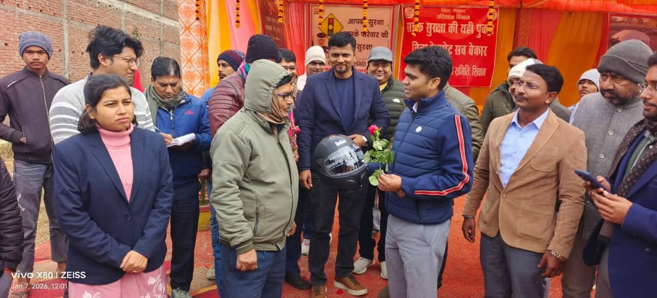 आज दिनांक,07 जनवरी 2026 को सड़क सुरक्षा माह के अंतर्गत जिला पदाधिकारी, सिवान श्री विवेक रंजन मैत्रेय एवं जिला परिवहन पदाधिकारी, सिवान के द्वारा बगैर हेलमेट के दुपहिया वाहन चलाने वालों को हेलमेट भेंट स्वरूप दिया गया। साथ ही आगे से भविष्य में हेलमेट पहनकर ही वाहन चलाने का संदेश दिया गया।