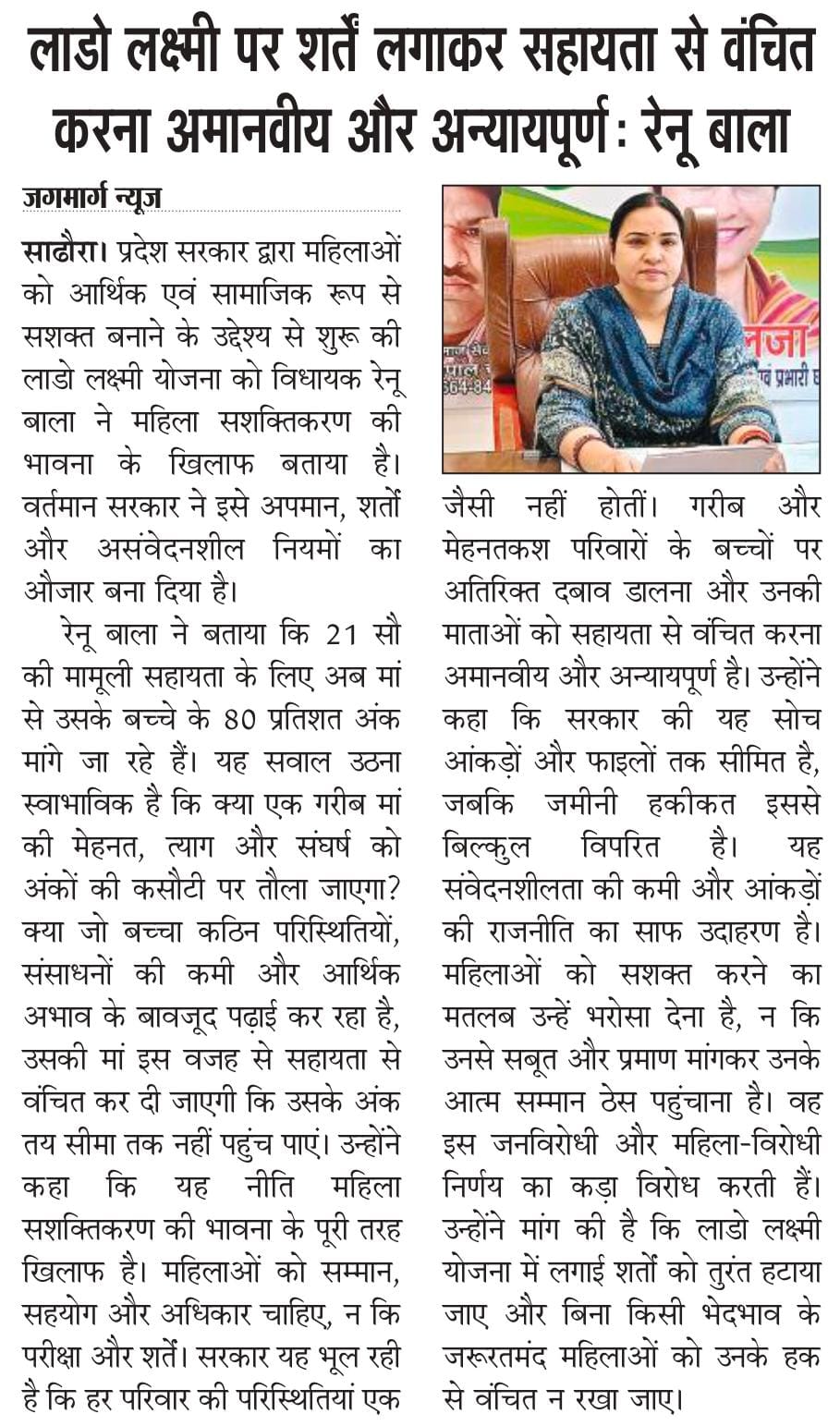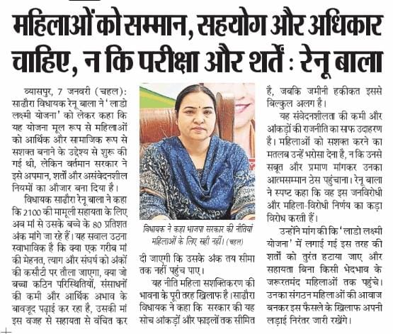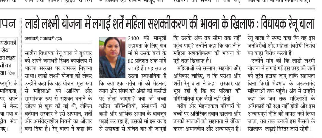 कपुरी :- हल्का सधौरा विधायक मैडम रेणु बाला जी नें बताया कि महिलाओं को सम्मान, सहयोग और अधिकार चाहिएँ न कि परीक्षा में बच्चों द्वारा 80 % से ऊपर नंबर आदि लेने कि शर्ते जो, बच्चा आर्थिक अभावों में पड़ेगा उससे इतने % नंबर लेने कि उम्मीद कम ही रखी जा सकती है !