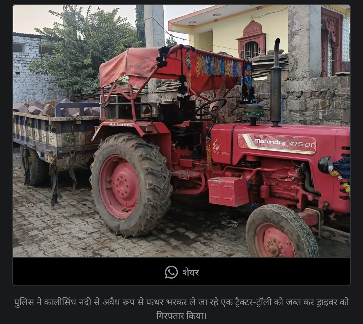 पनवाड़ में अवैध खनन पर पुलिस की बड़ी कार्रवाई: कालीसिंध नदी से पत्थर ले जा रहा ट्रैक्टर-ट्रॉली जब्त, ड्राइवर गिरफ्तार