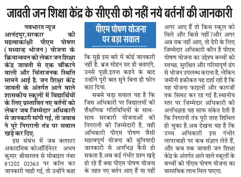 पीएम पोषण योजना पर बड़ा सवाल: जावती जन शिक्षा केंद्र के CAC को नहीं है नए बर्तनों की कोई जानकारी