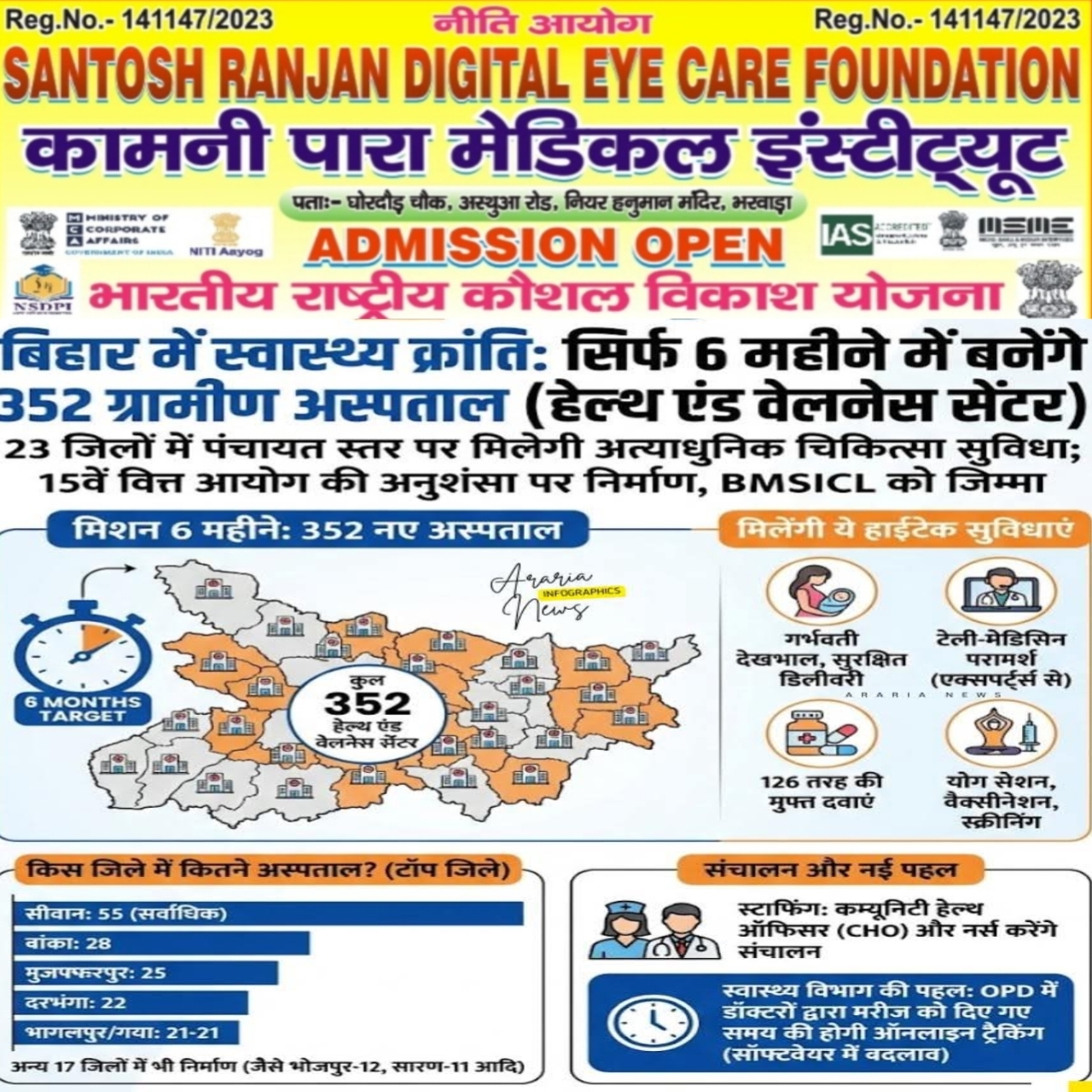🏥 बिहार में 6 महीने में 352 ग्रामीण हॉस्पिटल (हेल्थ एंड वेलनेस सेंटर) बनेंगे, 23 जिलों के विधानसभा क्षेत्रों में पंचायत स्तर पर स्वास्थ्य सुविधा।