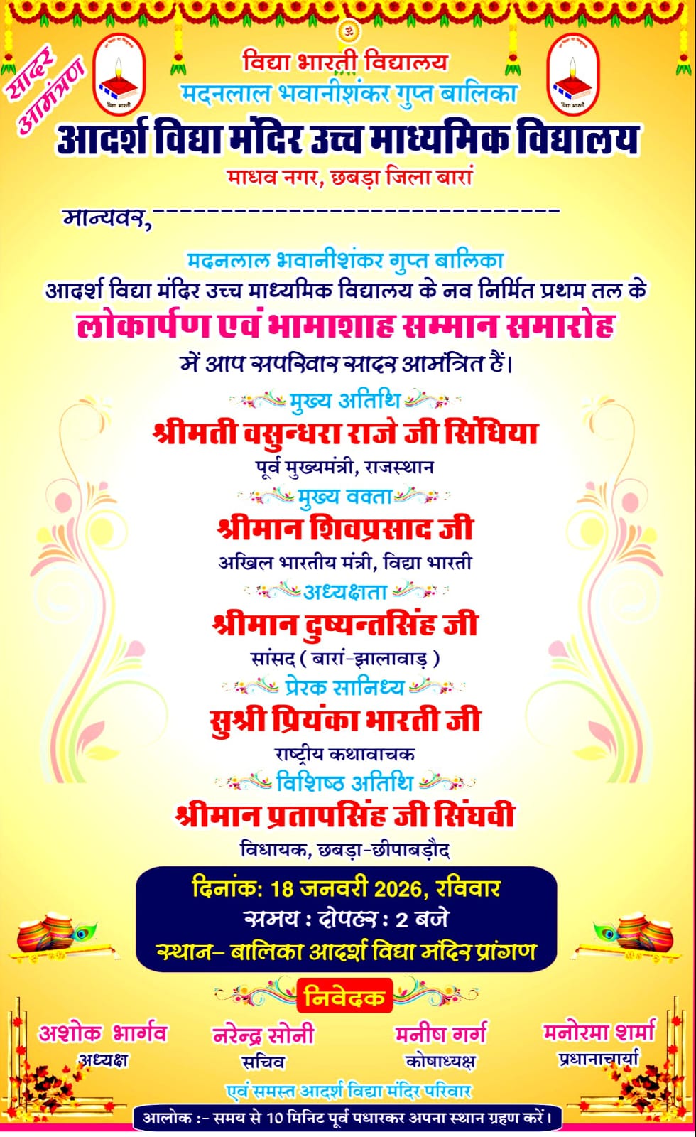 छबड़ा (बारां)। विद्या भारती विद्यालय माधव नगर में स्थित मदनलाल भवानीशंकरगुप्त बालिका आदर्श विद्या मंदिर उच्च माध्यमिक विद्यालय के नव निर्मित प्रथम तल का लोकार्पण एवं भामाशाह सम्मान समारोह 18 जनवरी 2026, रविवार को आयोजित किया जाएगा। प्रबंध समिति के अध्यक्ष अशोक कुमार भार्गव एवं सचिव नरेंद्र सोनी ने बताया कि इस गरिमामय कार्यक्रम में मुख्य अतिथि के रूप में *श्रीमती वसुंधरा राजे सिंधिया*, पूर्व मुख्यमंत्री, राजस्थान, उपस्थित रहेंगी।
