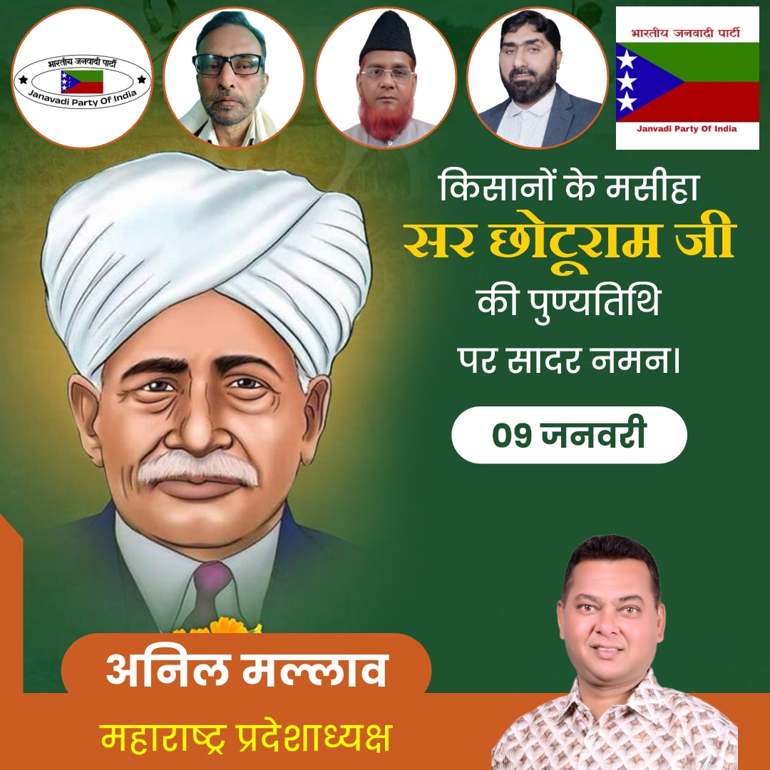 दिनांक 9 जनवरी 2025 किसानो के मसीहा सर छोटू रामजी की पुण्यतिथी हर साल नऊ जनवरी को मनाई जाती है भारतीय जनवादी पार्टी के राष्ट्रीय अध्यक्ष डॉक्टर ए के भारती और वरिष्ठ उपाध्यक्ष कारी जलील चिस्ती भारतीय जनवादी पार्टी से सभी देशवासीयो के किसानो को को बधाई दी.....