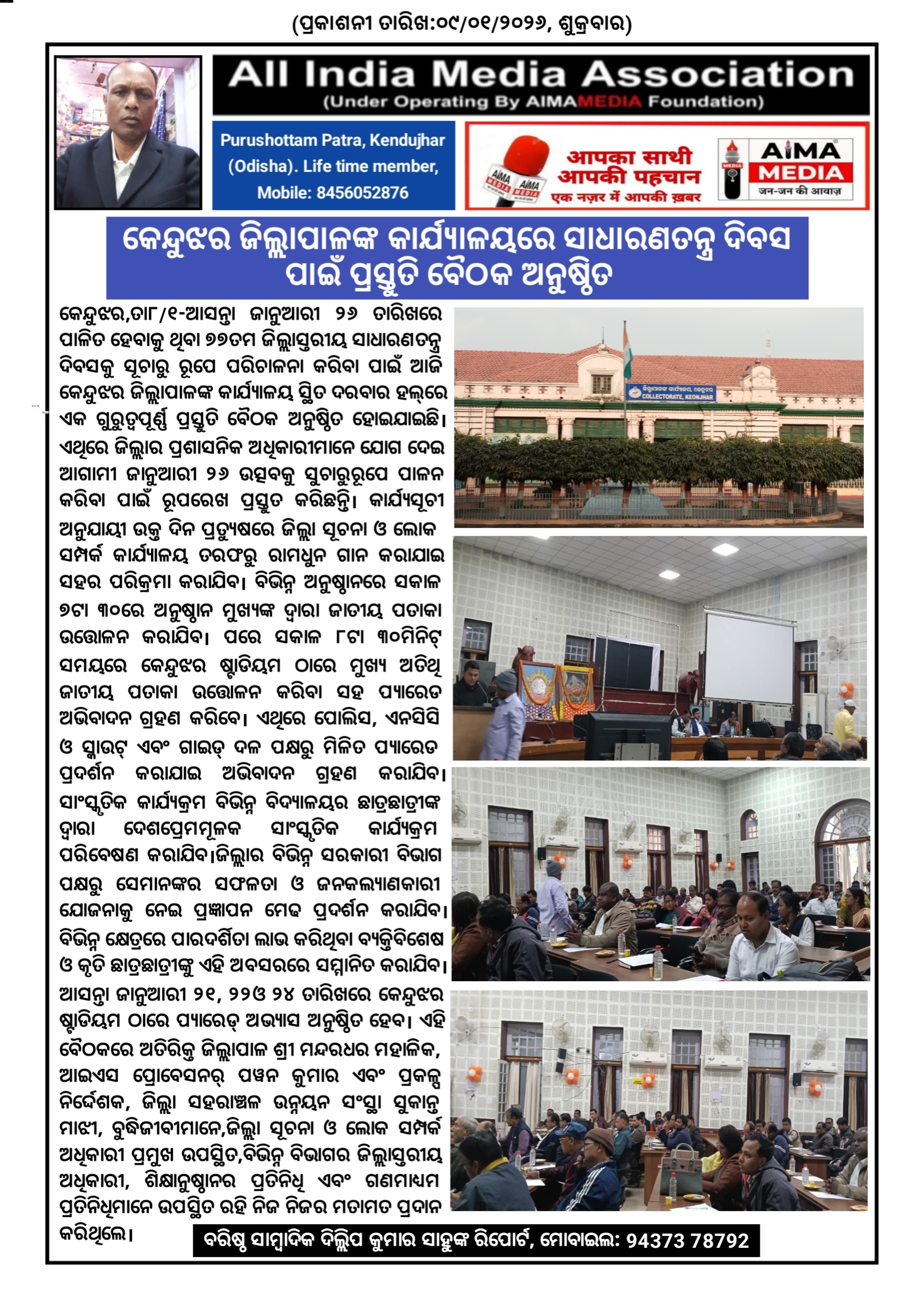 କେନ୍ଦୁଝର ଜିଲ୍ଲାପାଳଙ୍କ କାର୍ଯ୍ୟାଳୟରେ ସାଧାରଣତନ୍ତ୍ର ଦିବସ ପାଇଁ ପ୍ରସ୍ତୁତି ବୈଠକ ଅନୁଷ୍ଠିତ।