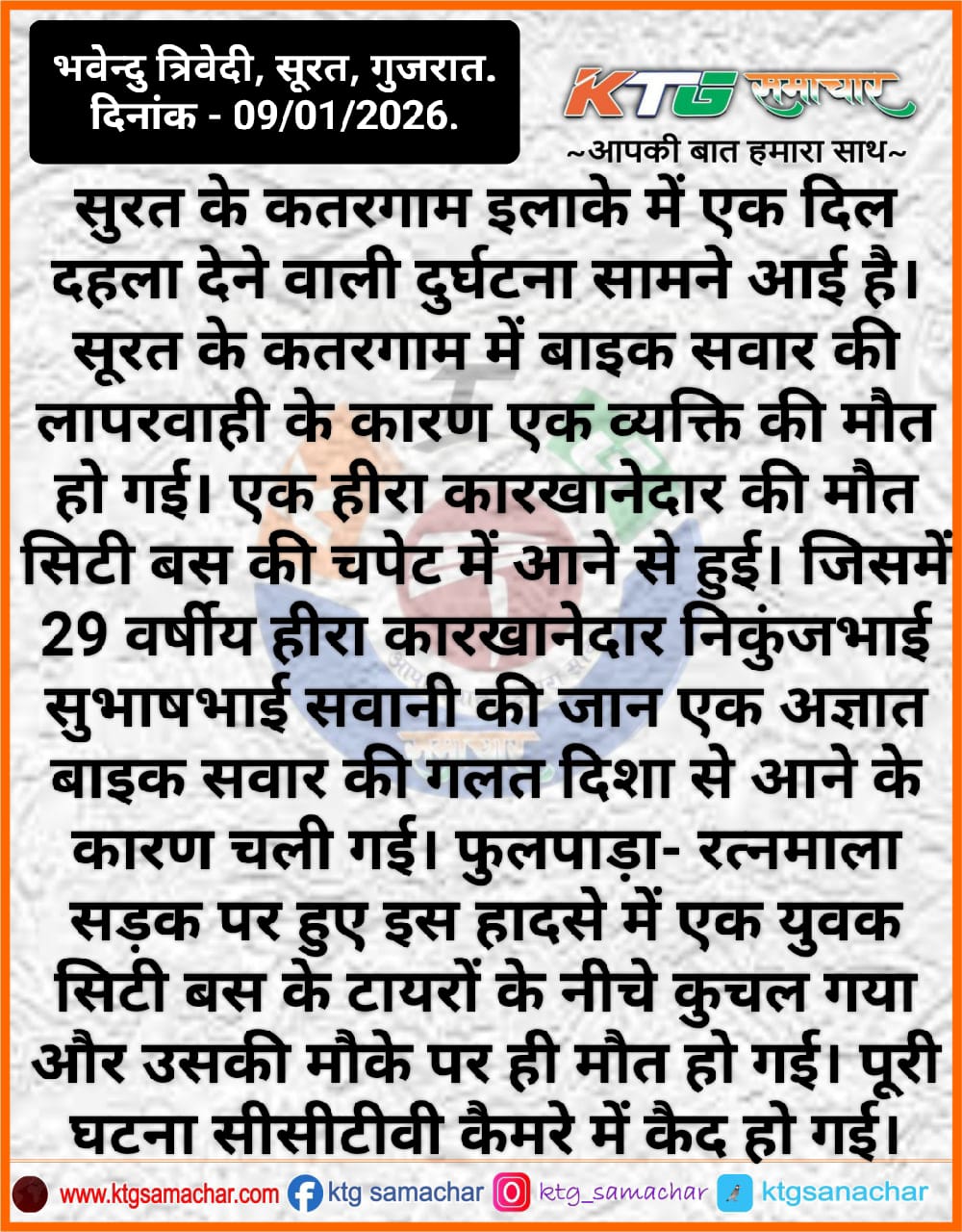 सूरत के कतारगाम में बाइक सवार की लापरवाही के कारण एक व्यक्ति की मौत हो गई।