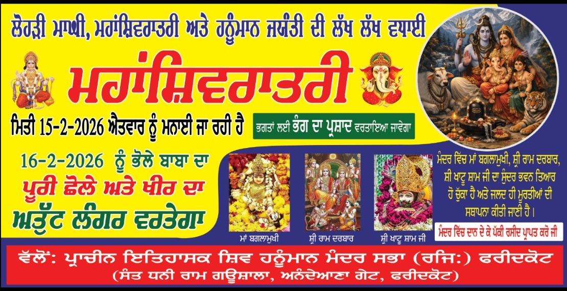ਹਰ ਸਾਲ ਦੀ ਤਰ੍ਹਾਂ ਇਸ ਸਾਲ ਵੀ ਪ੍ਰਾਚੀਨ ਇਤਿਹਾਸਕ ਸ਼ਿੱਵ ਹਨੁੰਮਾਨ ਮੰਦਰ ਅਨੰਦਿਆਣਾ ਗੇਟ ਸਭਾ ਰਜਿਸਟਰ /ਸੰਤ ਧਨੀ ਰਾਮ ਗਉਸ਼ਾਲਾ ਫਰੀਦਕੋਟ ਵਿੱਚ ਸ਼ਿਵਰਾਤਰੀ ਦਾ ਤਿਉਹਾਰ ਬੜੀ ਧੂਮ ਧਾਮ ਨਾਲ ਮਨਾਇਆ ਜਾ ਰਿਹਾ ਹੈ ਸਾਰੇ ਸ਼ਹਿਰਾਂ ਨਿਵਾਸੀਆਂ ਨੂੰ ਬੇਨਤੀ ਹੈ ਕਿ ਮਿਤੀ 15.02.26 ਸ਼ਿਵਰਾਤਰੀ 16.02.26 ਅਤੁੱਟ ਲੰਗਰ ਪ੍ਰਭੂ ਇੱਛਾ ਤੱਕ ਵਰਤਾਇਆ ਜਾਵੇਗਾ