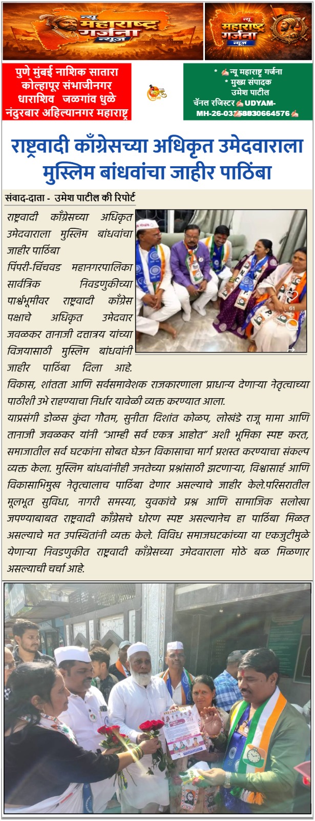 पिंपरी-चिंचवड महानगरपालिका सार्वत्रिक निवडणुकीच्या पार्श्वभूमीवर राष्ट्रवादी काँग्रेस पक्षाचे अधिकृत उमेदवार जवळकर तानाजी दत्तात्रय यांच्या विजयासाठी मुस्लिम बांधवांनी जाहीर पाठिंबा दिला आहे. विकास, शांतता आणि सर्वसमावेशक राजकारणाला प्राधान्य देणाऱ्या नेतृत्वाच्या पाठीशी उभे राहण्याचा निर्धार यावेळी व्यक्त करण्यात आला.