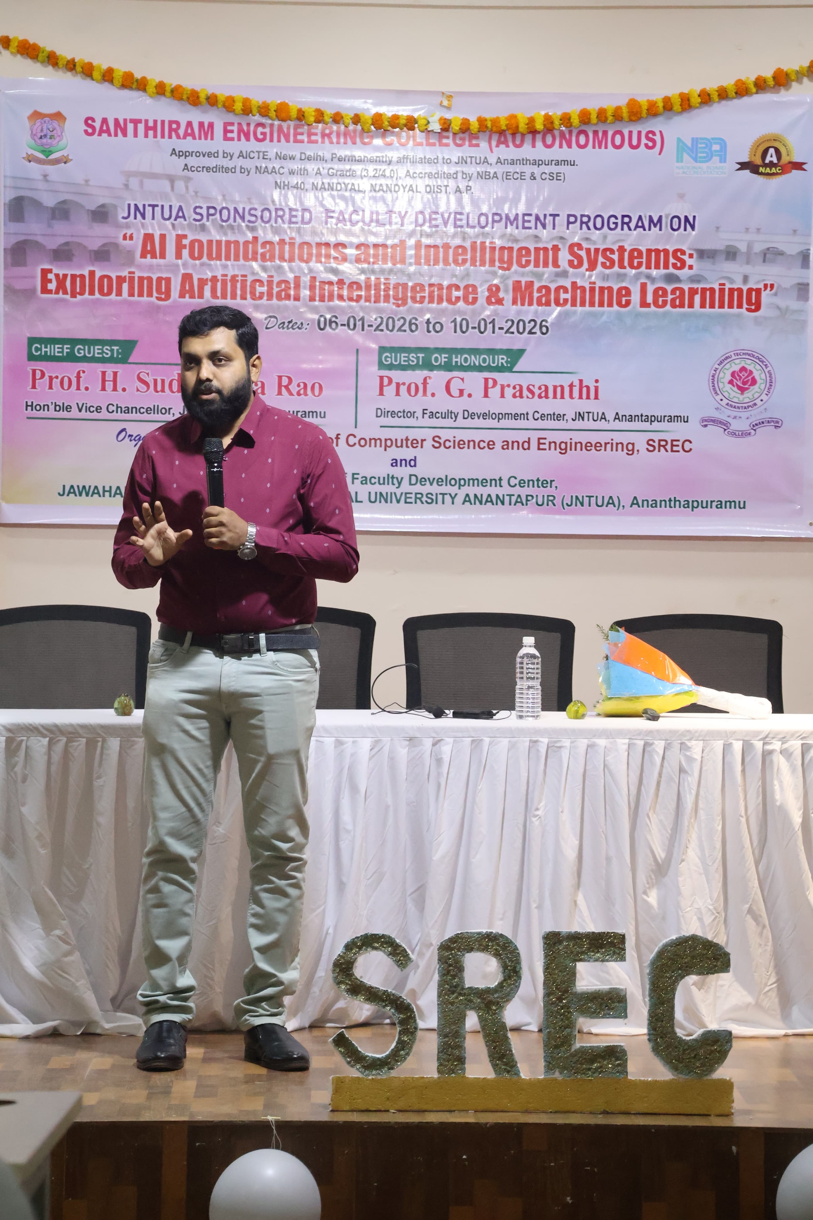 పాణ్యం (AIMA MEDIA ): పాణ్యం మండలం నెరవాడ పరిధిలోని శాంతిరాం ఇంజనీరింగ్ కాలేజీ లో కంప్యూటర్ సైన్స్ అండ్ ఇంజనీరింగ్ (CSE) విభాగం మరియు జేఎన్‌టీయూ ఏ – ఫ్యాకల్టీ డెవలప్‌మెంట్ సెంటర్ (FDC) సంయుక్తంగా నిర్వహిస్తున్న ఫ్యాకల్టీ డెవలప్‌మెంట్ ప్రోగ్రామ్ (FDP) నాలుగో రోజు కార్యక్రమం శుక్రవారం విజయవంతంగా నిర్వహించారు. ఈ కార్యక్రమంలో అధ్యాపకులు మరియు పరిశోధకులు ఉత్సాహంగా పాల్గొన్నారు.ఉదయం సెషన్‌కు ఏబీటెక్ విల్ (ABTech Ville) వ్యవస్థాపకుడు శ్రీ ఏ. భరద్వాజ్ వనరుల వ్యక్తిగా పాల్గొని, ఫస్ట్ ఆర్డర్ లాజిక్, యూనిఫికేషన్, ఫార్వర్డ్ మరియు బ్యాక్‌వర్డ్ చైనింగ్, రెసల్యూషన్ అంశాలపై లోతైన వివరణ ఇచ్చారు. అనంతరం నిర్వహించిన హ్యాండ్స్-ఆన్ సెషన్ ద్వారా పాల్గొన్నవారికి ఆ అంశాలపై ప్రాయోగిక అవగాహన కలిగించారు.మధ్యాహ్న సెషన్‌ను బ్రెయిన్ ఓ విజన్ (Brain O Vision) సంస్థకు చెందిన ఏఐ జనరలిస్ట్ బి. దినేష్ కుమార్ నిర్వహించారు. ఈ సెషన్‌లో స్టాటిస్టికల్ లెర్నింగ్ పద్ధతులు, రీఫోర్స్‌మెంట్ లెర్నింగ్ వంటి అంశాలపై వివరణ ఇచ్చారు. అదేవిధంగా ఓపెన్‌ఏఐ (OpenAI) ఉపయోగించి డిసిషన్ ట్రీలు మరియు రీఫోర్స్‌మెంట్ లెర్నింగ్‌పై హ్యాండ్స్-ఆన్ సెషన్ నిర్వహించడంతో పాల్గొన్నవారికి ఆధునిక ఏఐ సాంకేతికతలపై విలువైన అనుభవం లభించింది.