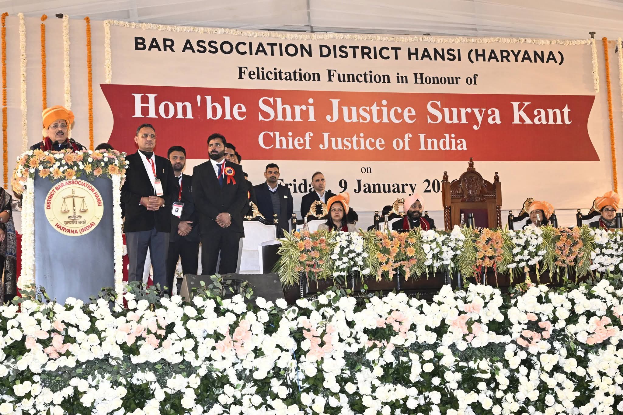 हरियाणा, हांसी, 9 जनवरी को भारत के माननीय मुख्य न्यायाधीश न्यायमूर्ति श्री सूर्यकांत ने कहा कि वैश्विक चुनौतियों और बदलते अपराध स्वरूप से प्रभावी ढंग से निपटने के लिए अधिवक्ताओं को आधुनिक तकनीकों को अपनाना होगा। न्यायपालिका में तकनीक का उपयोग तेजी से बढ़ रहा है और विभिन्न भाषाओं में न्यायालयों के निर्णयों का अनुवाद कर उन्हें आमजन तक पहुंचाया जा रहा है, ताकि लोग न्यायिक फैसलों को सहजता से समझ सकें।