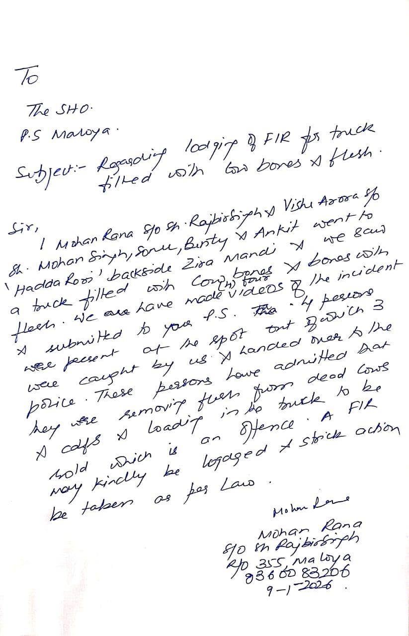 उन्होंने बताया कि मलोया में हड्डा रोड़ी के नाम पर नगर निगम द्वारा दी गई जगह पर गौ माता का अवैध वध किया जा रहा है। मौके से लगभग 100 गौ माता के कंकाल और गौ खालें बरामद हुई हैं, जबकि गौ मांस मौके पर नहीं मिला, जो गंभीर संदेह पैदा करता है। कर्मचारियों के अनुसार आज भी 12 गौ माता का शव लाया गया फिर उसे काटा गया ।