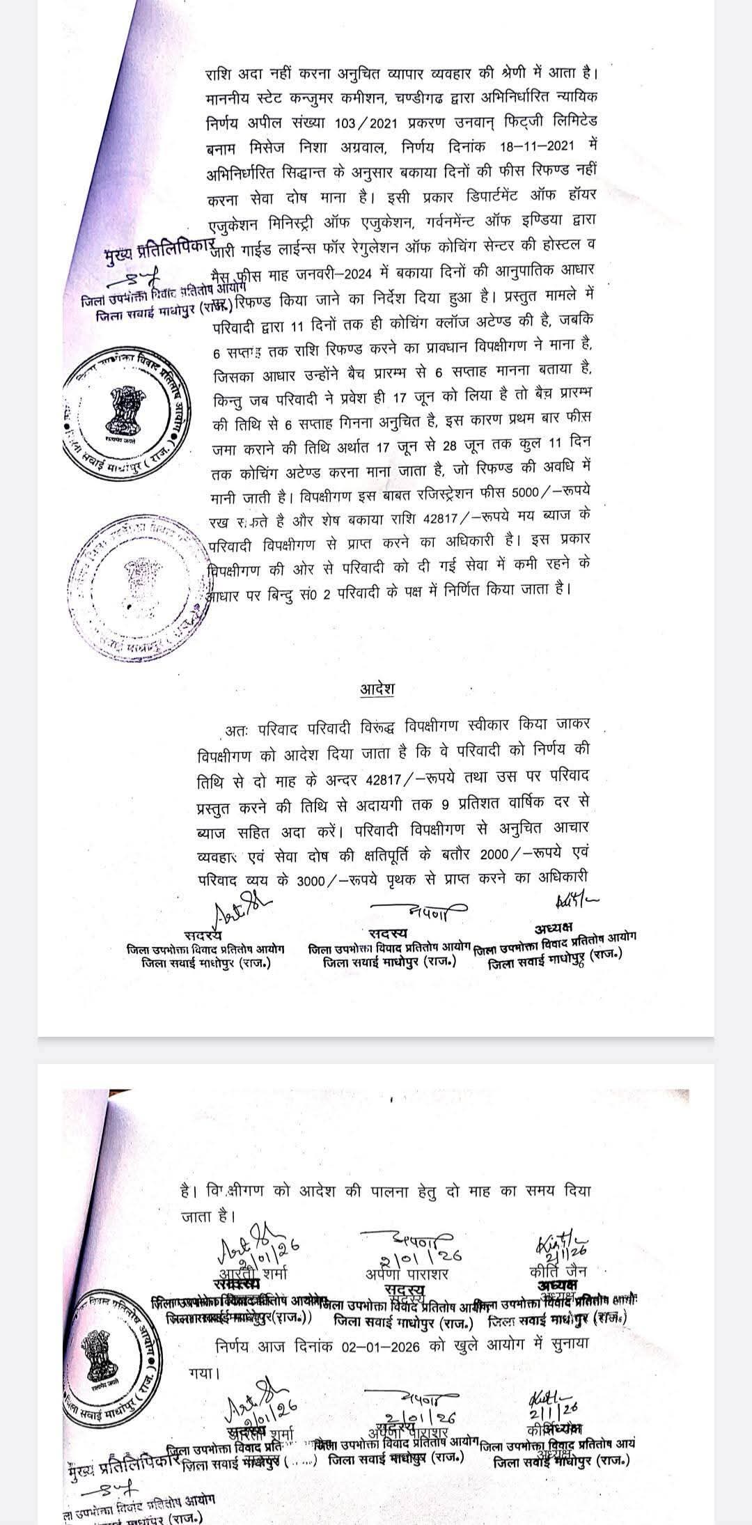 देश की प्रसिद्ध कोचिंग #फिजिक्सवाला के #जयपुर सेंटर में लिया था एडमिशन ..एडवान्स 48000 रुपये ले लिये..लेकिन सुविधाओं के नाम पर जो बताया था वो कुछ नहीं विद्यार्थी ने 5 दिन ही क्लास ली..... पर कोचिंग सेंटर ने मना कर दिया एडवान्स फीस लौटाने से.......अभिभावक ने परेशान हो जिला #सवाईमाधोपुर उपभोक्ता आयोग में लगाया परिवाद...... बहस के दोरान एडवोकेट हरिप्रसाद योगी ने राष्ट्रीय आयोग के निर्णय प्रस्तुत किये ..जिसमें किसी भी कोचिंग संस्थान द्वारा एडवान्स राशी वसूलना..अनुचित व्यापार व्यवहार सेवा माना गया है..इस आधार कंज्यूमर कोर्ट ने स्टूडेंट की एडवान्स जमा राशी ब्याज सहित एवं क्षतिपूर्ति देने के आदेश दिये... कुल मिलाकर कोई भी मोनोपोली या भ्रामक विज्ञापन अनुचित व्यापार व्यहवार ....अपनीआवाज जरूर उठाये........