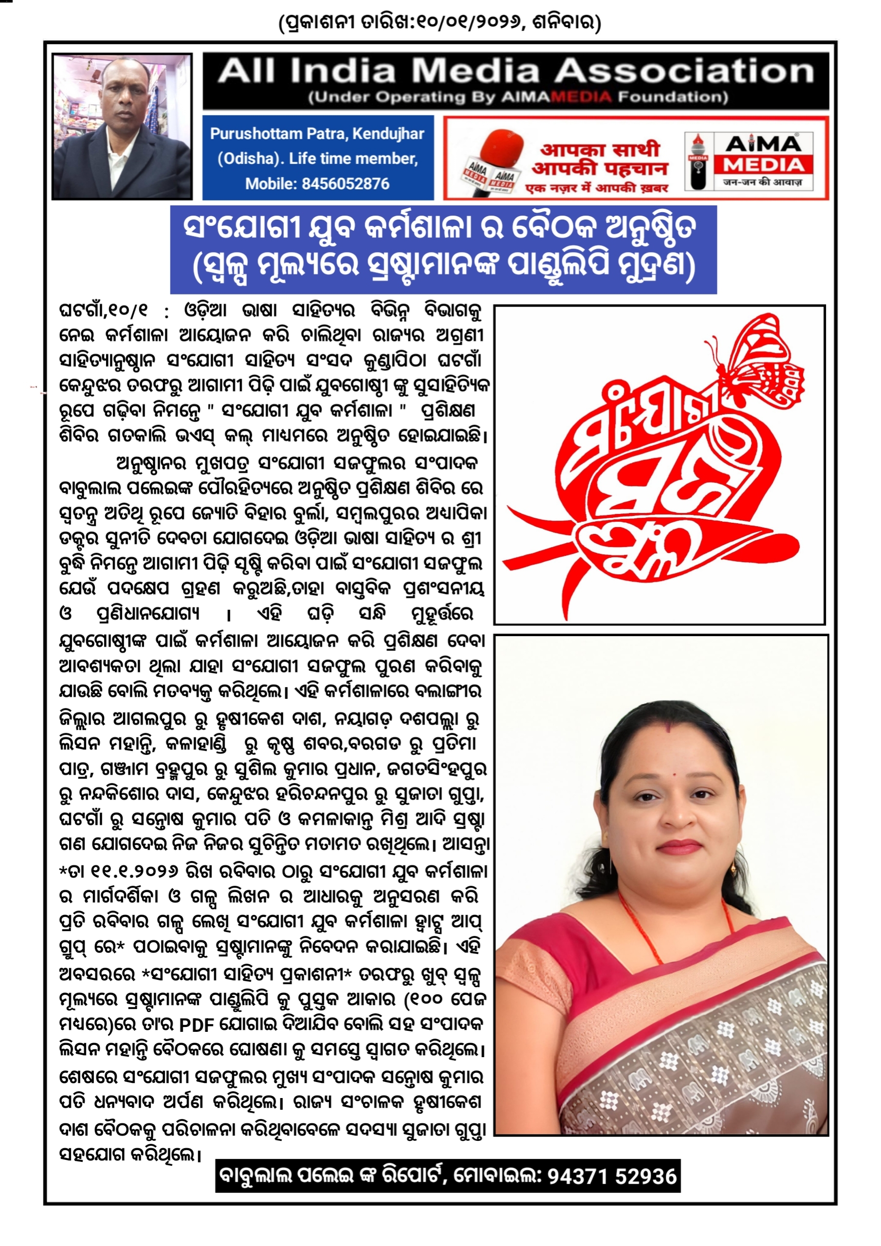 ସଂଯୋଗୀ ଯୁବ କର୍ମଶାଳା ର ବୈଠକ ଅନୁଷ୍ଠିତ (ସ୍ଵଳ୍ପ ମୂଲ୍ୟରେ ସ୍ରଷ୍ଟାମାନଙ୍କ ପାଣ୍ଡୁଲିପି ମୁଦ୍ରଣ)