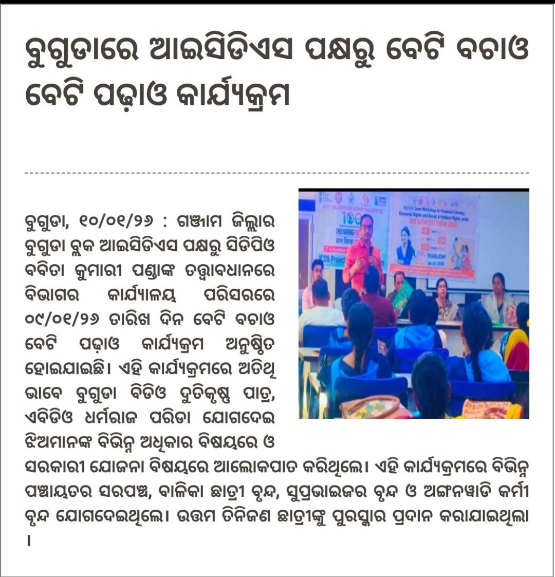ICDS ପଷରୁ ବୁଗୁଡ଼ାରେ ବେଟି ବେଟି ବଚାଓ ବେଟି ପଢାଓ କାର୍ଯ୍ୟକ୍ରମ।