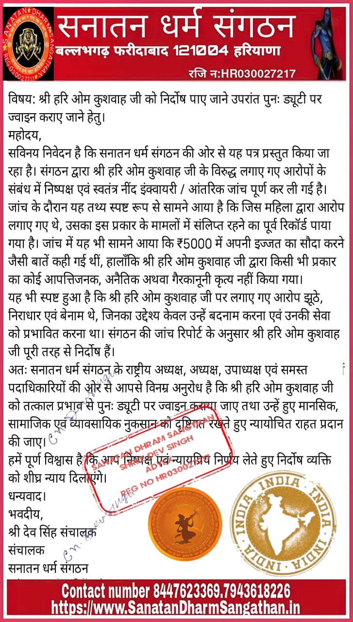 सविनय निवेदन है कि सनातन धर्म संगठन की ओर से यह पत्र प्रस्तुत किया जा रहा है। संगठन द्वारा श्री हरि ओम कुशवाह जी के विरुद्ध लगाए गए आरोपों के संबंध में निष्पक्ष एवं स्वतंत्र नींद इंक्वायरी / आंतरिक जांच पूर्ण कर ली गई है।