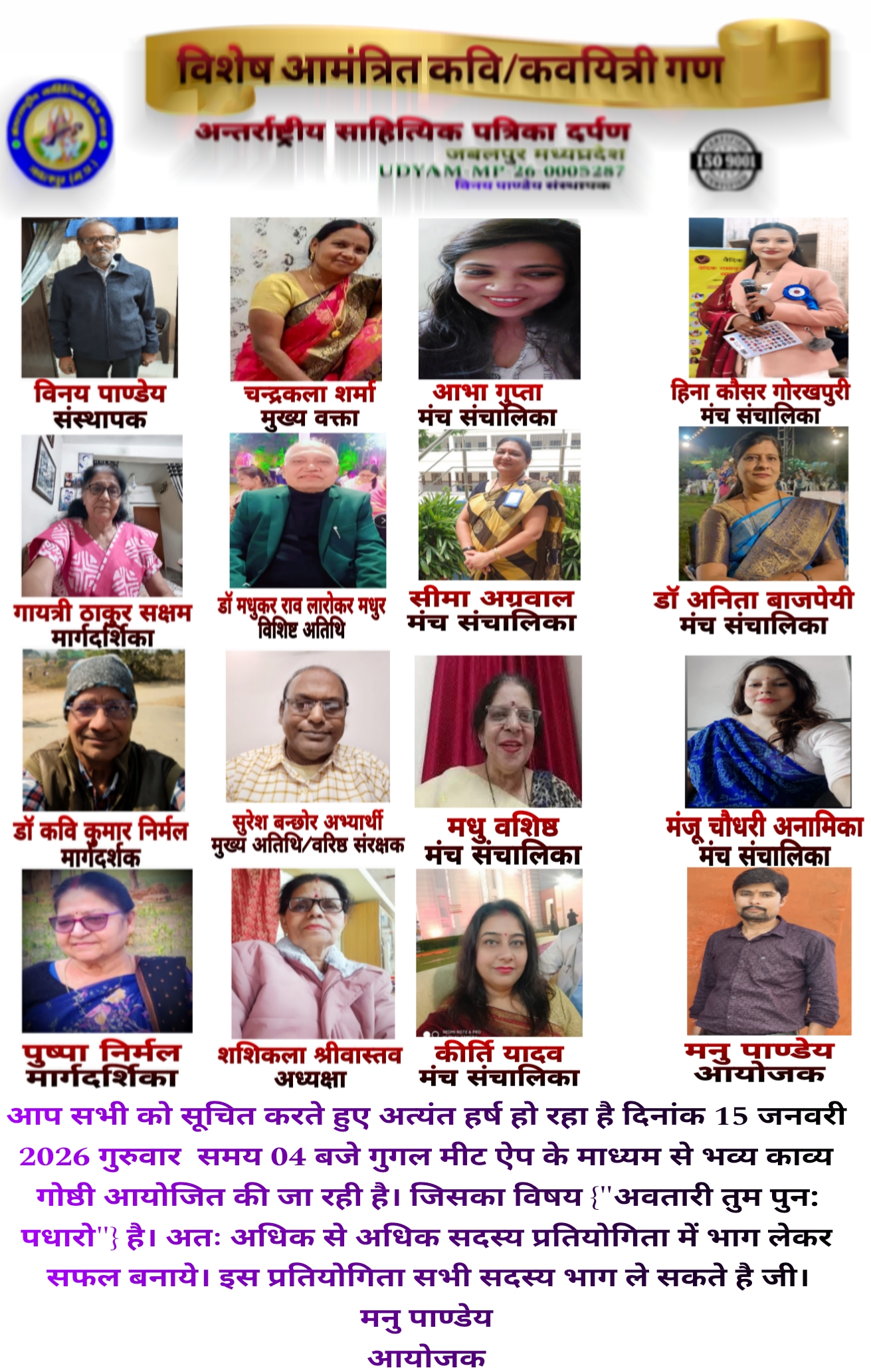 दिनांक 15 जनवरी 2026 गुरुवार को गुगल मीट के माध्यम से भव्य काव्य गोष्ठी आयोजित हो रही है।