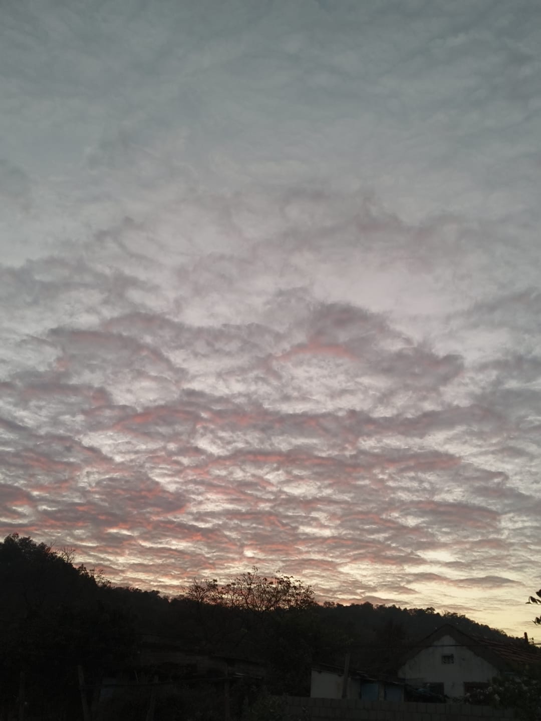 రంగుల మేళవింపు: సూర్యాస్తమయం లేదా సూర్యోదయం సమయంలో వచ్చే లేత ఎరుపు, గులాబీ రంగు ఛాయలు మేఘాలకు ఒక ప్రత్యేకమైన అందాన్ని ఇచ్చాయి. కింద ఉన్న చెట్లు, కొండలు చిన్న ఇల్లు చూస్తుంటేప్రకృతిలోని ఇలాంటి దృశ్యాలు మనసుకి ఎంతో హాయినిస్తాయి. మంచిర్యాల జిల్లాలోని జన్నారం మండల్ ఇందన్ పెళ్లి గ్రామంలో సాయంత్రం 6:38 నిముషాలకు ఇలా ఆకాశం ఇలా ప్రజలకు ధరస్నానం ఇచ్చింది ఇది వాట్సాప్ గ్రూపులో చెక్కర్లు కొడుతుంది.