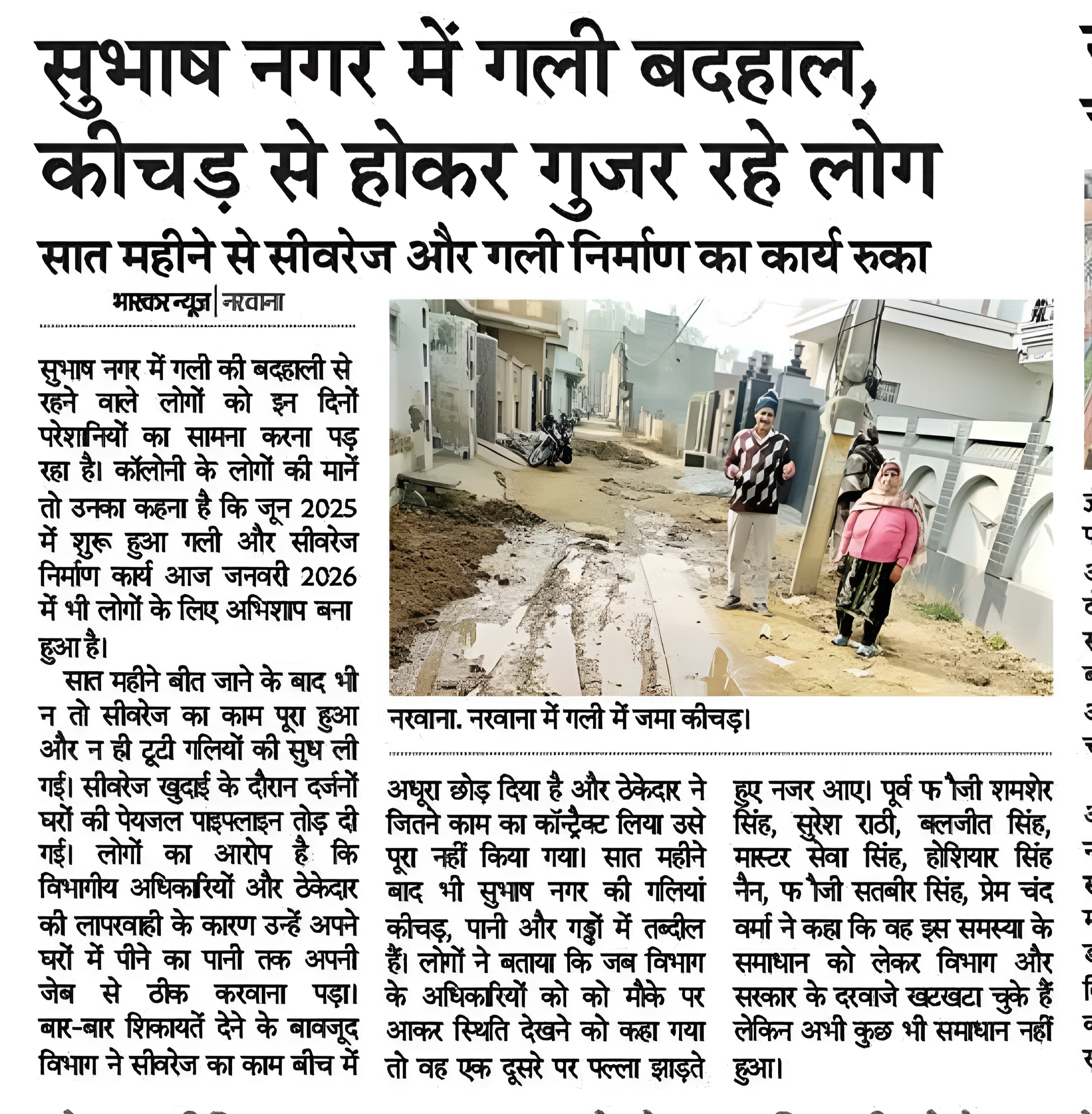 मौसम बदले, साल बदला, सरकारें बदलीं, लेकिन सुभाष नगर नरवाना के लोगों की किस्मत नहीं बदली। जून 2025 में शुरू हुआ गली और सीवरेज निर्माण कार्य आज जनवरी 2026 में भी लोगों के लिए अभिशाप बना हुआ है। सात महीने बीत जाने के बाद भी न तो सीवरेज का काम पूरा हुआ और न ही टूटी गलियों की सुध ली गई।