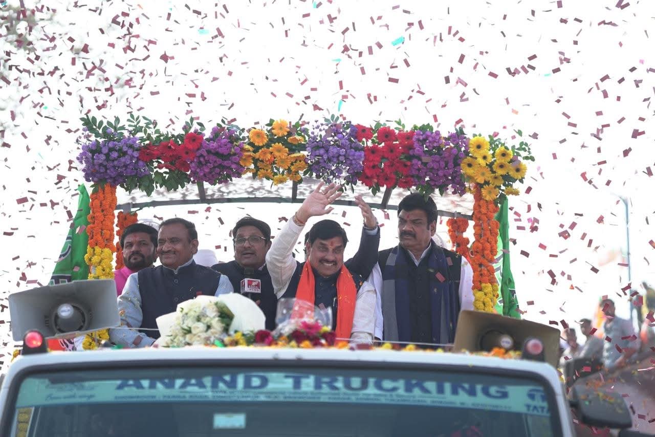 स्नेह की पुष्पवर्षा…मुख्यमंत्री डॉ. मोहन यादव का सागर जिले के खुरई में आयोजित रोड शो के दौरान स्थानीय नागरिकों द्वारा पुष्पवर्षा कर आत्मीय स्वागत एवं अभिनंदन किया गया।Dr Mohan Yadav #CMMadhyaPradesh